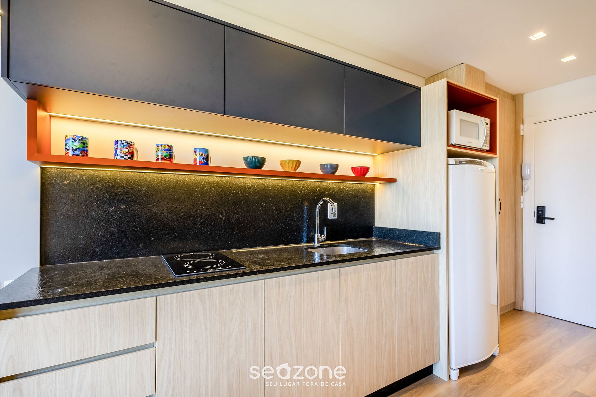 - Cozinha completa com geladeira, fogão cooktop (indução), micro-ondas, sanduicheira, cafeteira elétrica, chaleira elétrica, liquidificador, taças de vinho, panelas, louças e utensílios;