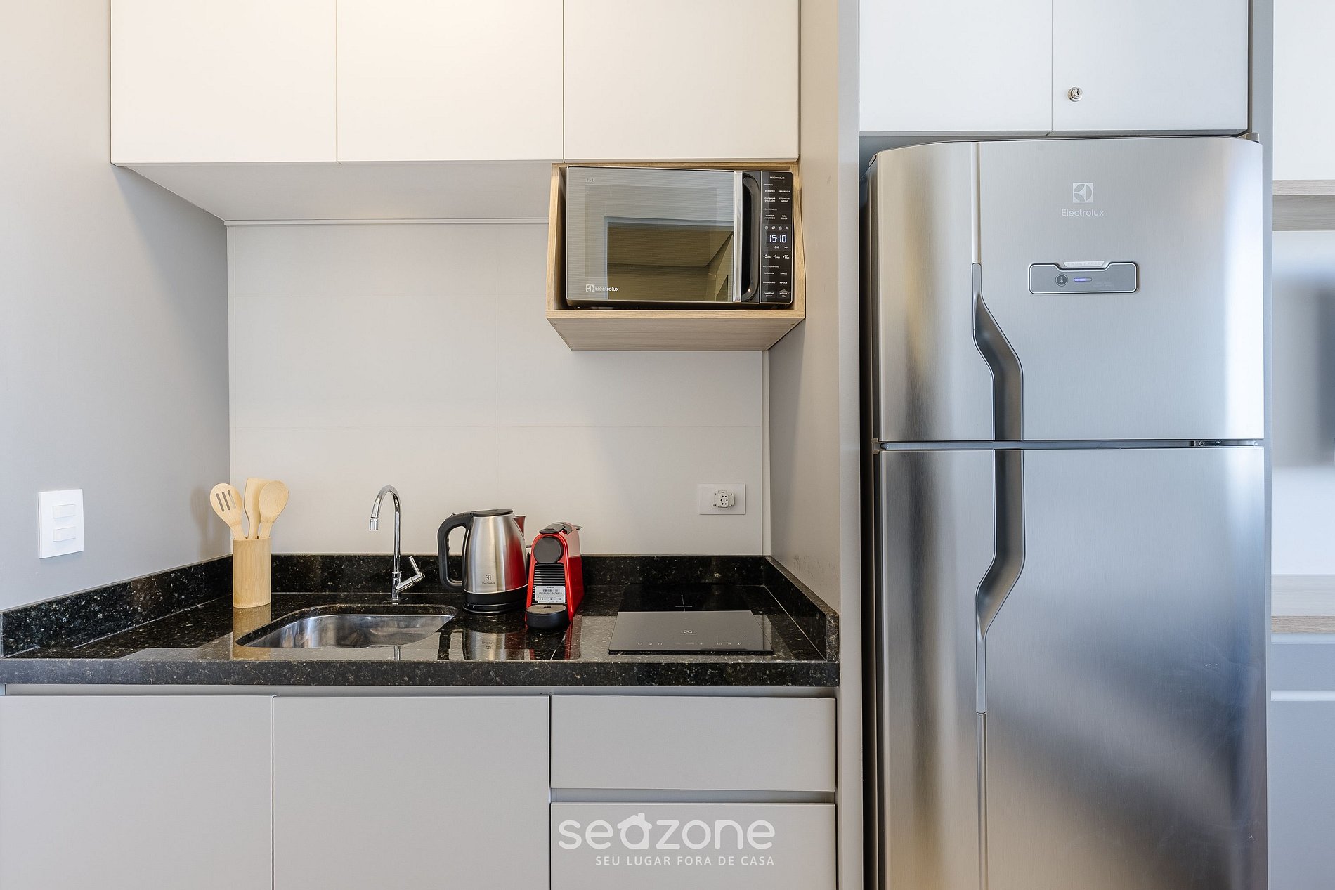 - Cozinha completa com geladeira, fogão cooktop por indução a gás, microondas, sanduicheira, Kit café (suporte para filtro, garrafa térmica), chaleira elétrica, liquidificador, taças de vinho, panelas, louças e utensílios;