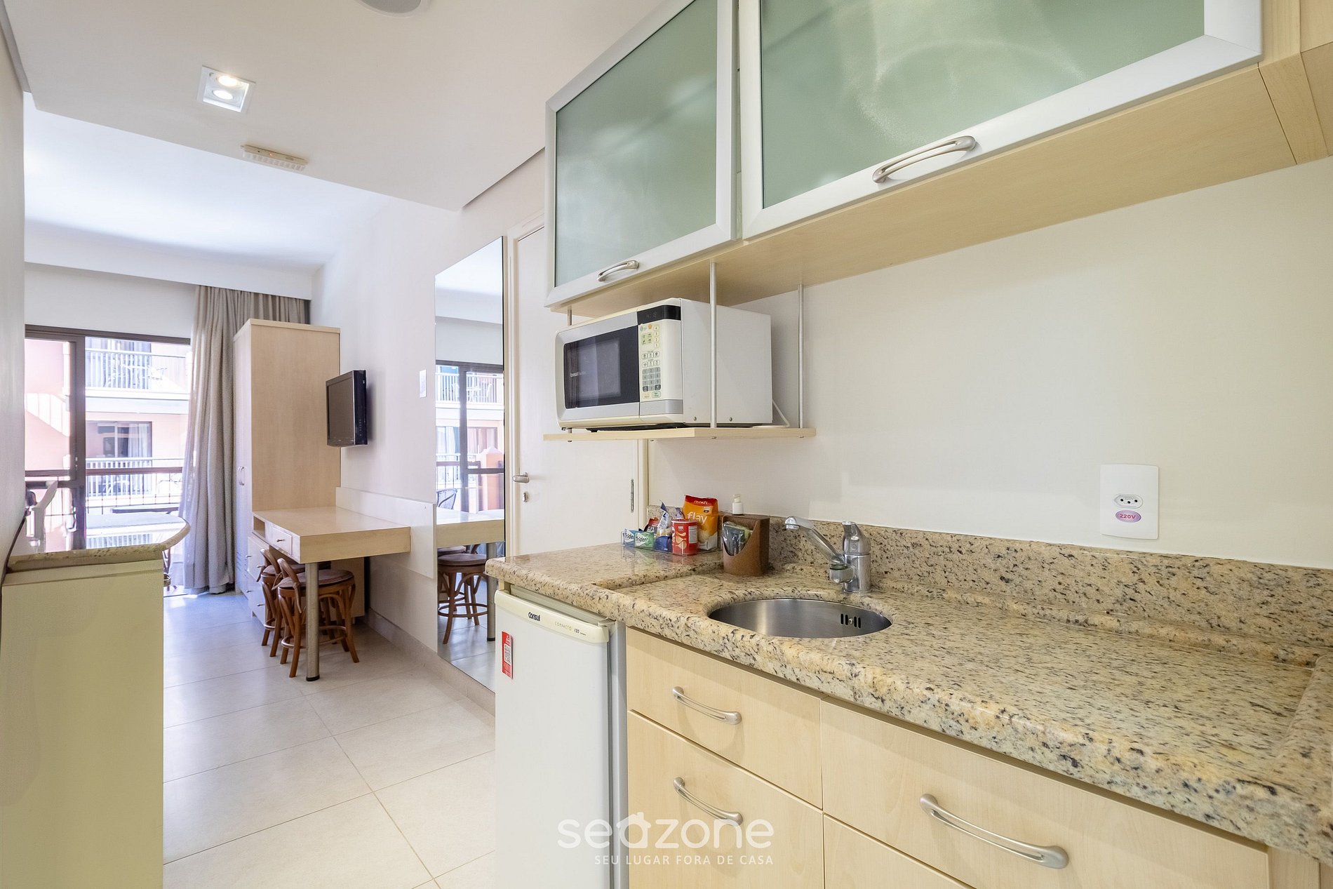 - Cozinha compacta com frigobar, microondas e utensílios;