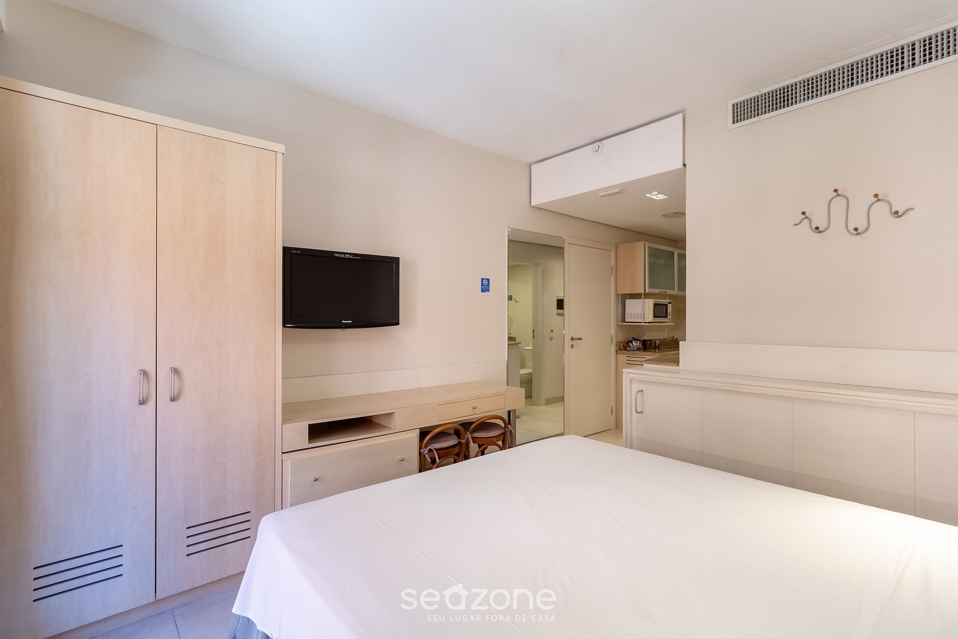 Experimente o melhor da hospedagem em um studio completo e moderno, com cama queen, ar-condicionado, TV, cozinha compacta, além de uma varanda com vista incrível para o mar e para a piscina. O resort oferece acesso direto à praia, além de diversas comodidades, como piscina, sauna, academia e até serviço de concierge. Localizado em uma das praias mais exclusivas de Florianópolis.