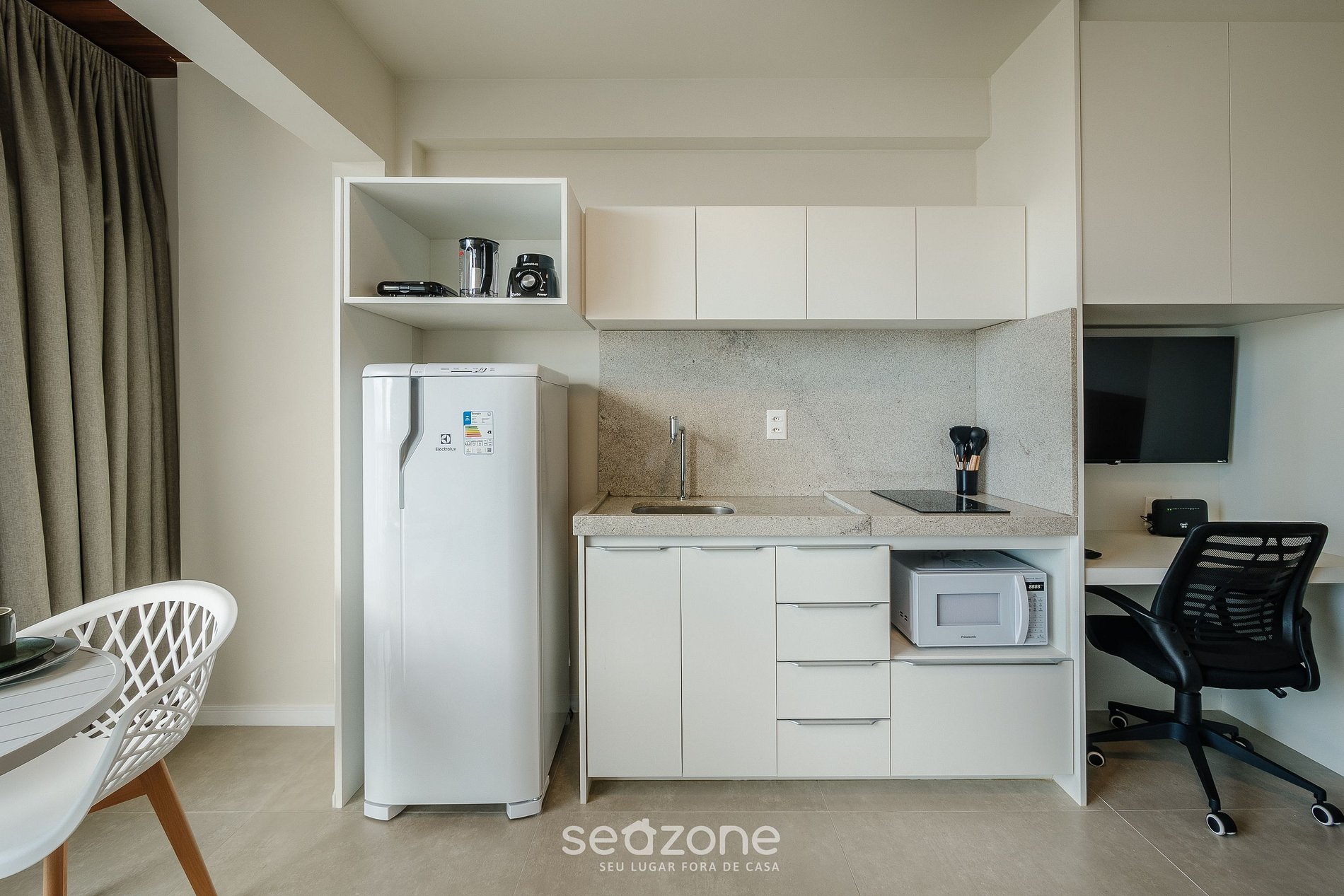 - Cozinha completa com geladeira, fogão cooktop (indução), microondas, sanduicheira, Kit café (suporte para filtro, garrafa térmica), liquidificador, taças de vinho, panelas, louças e utensílios;