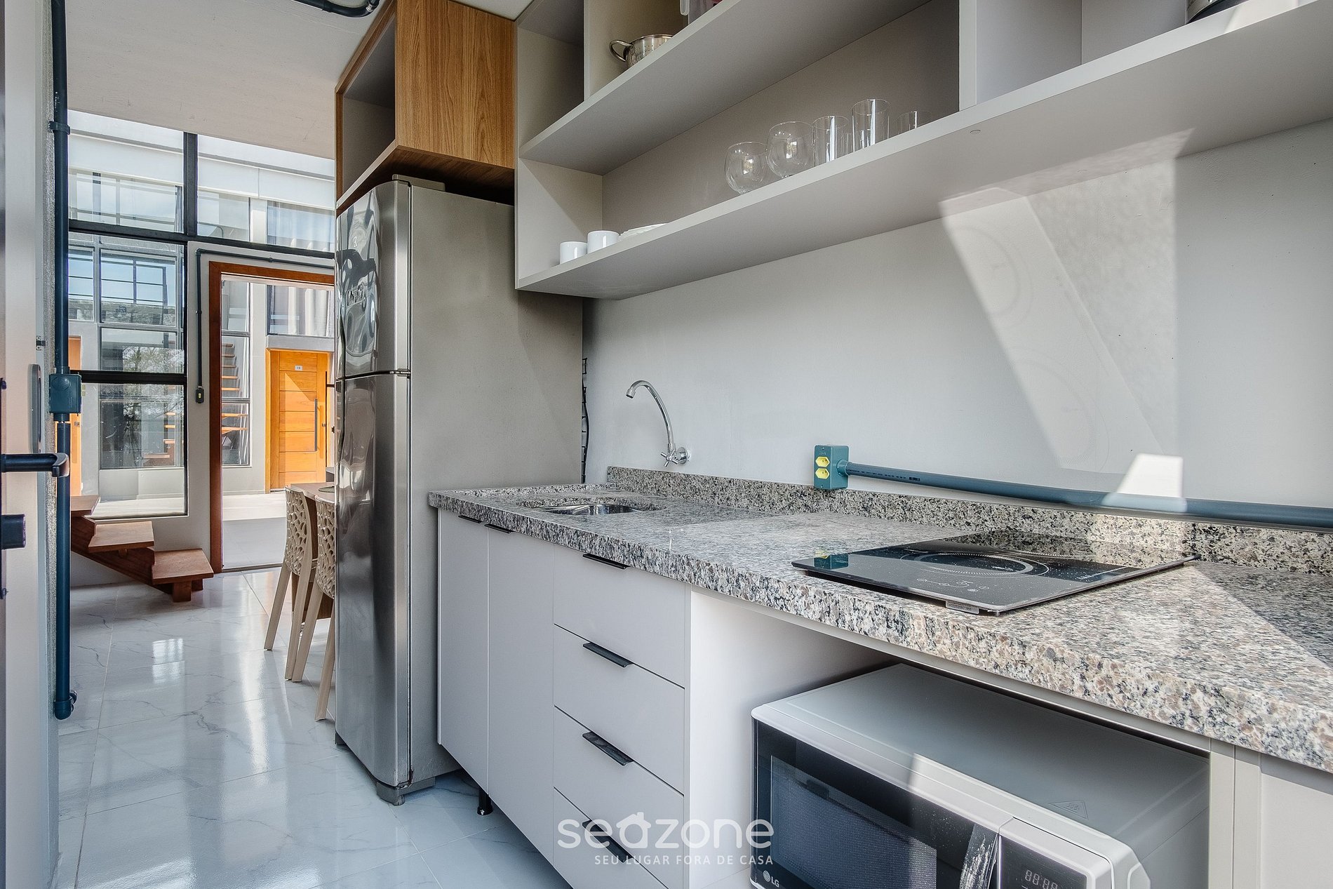 - Cozinha completa com geladeira, fogão cooktop (indução), micro-ondas, sanduicheira, cafeteira elétrica, chaleira, liquidificador, taça de vinho, panelas, louças e utensílios;