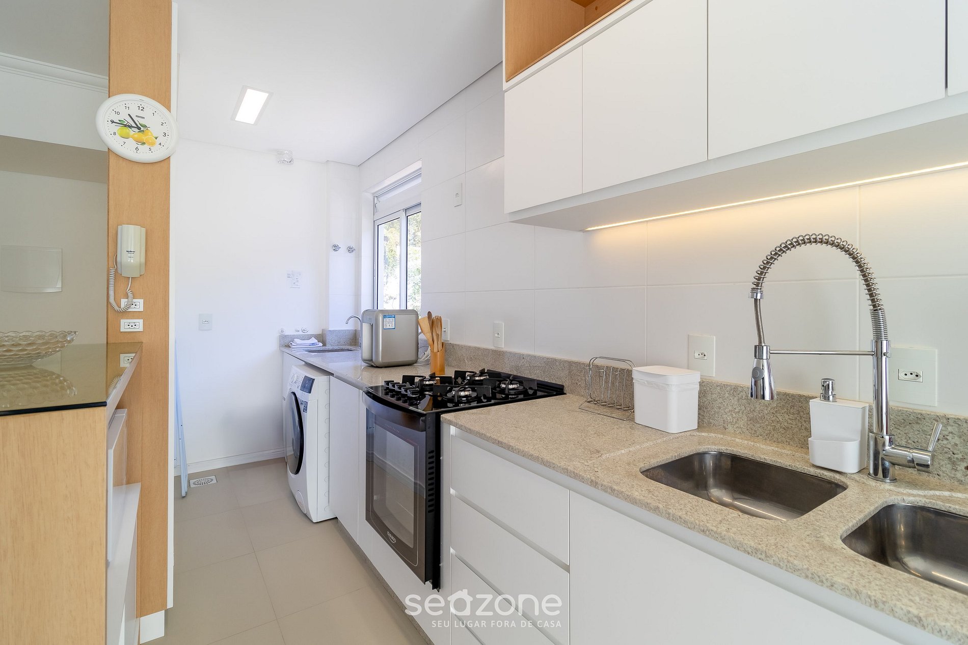 - Cozinha completa com geladeira, fogão, forno, micro-ondas, sanduicheira, chaleira, liquidificador, panelas, louças e utensílios;
