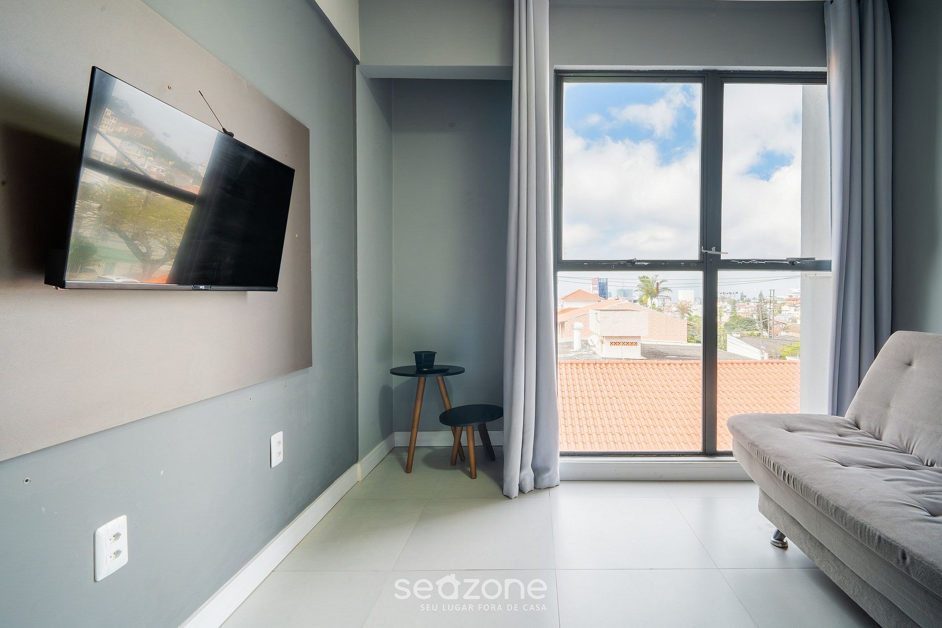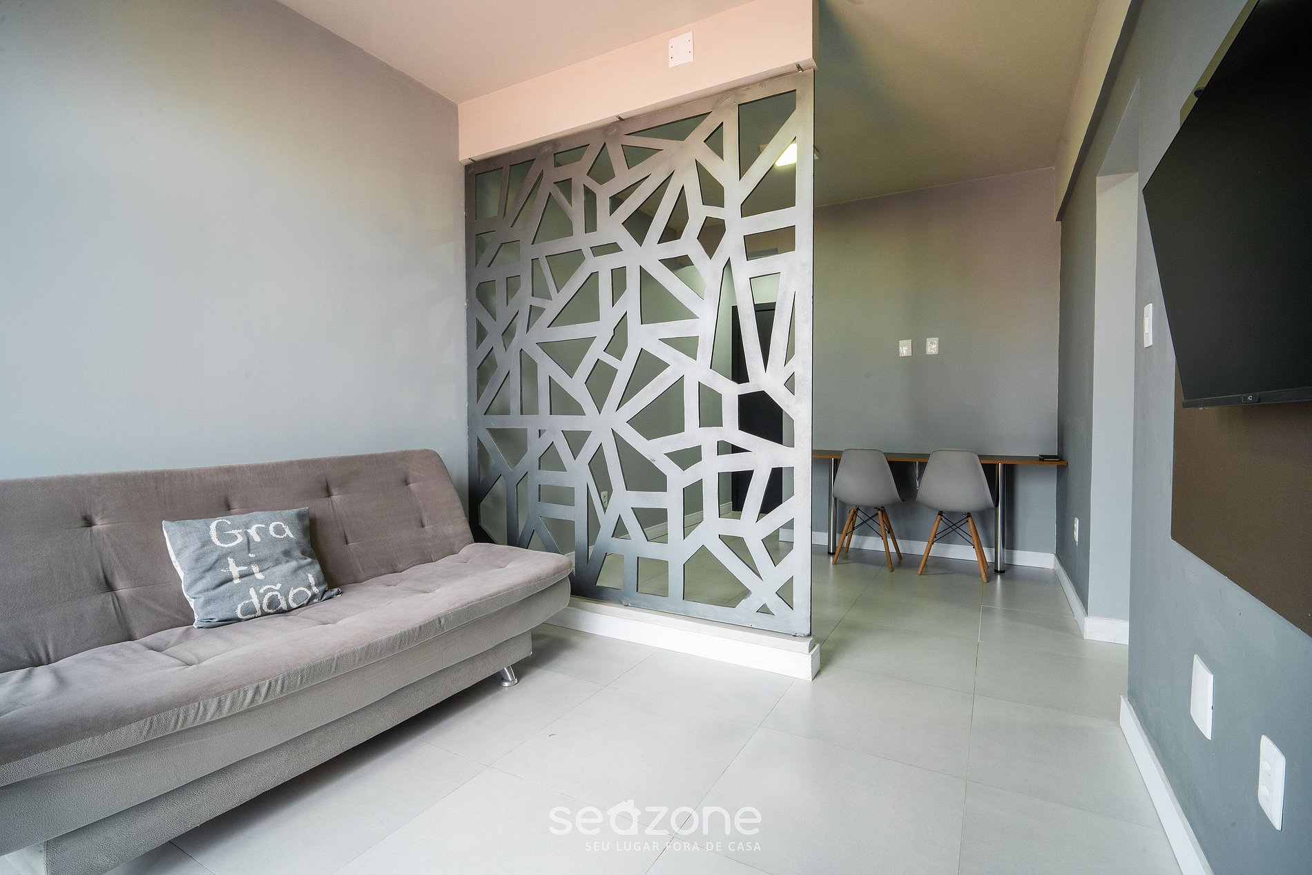 - Sala de estar com sofá-cama de casal, bancada para trabalho e Smart TV;