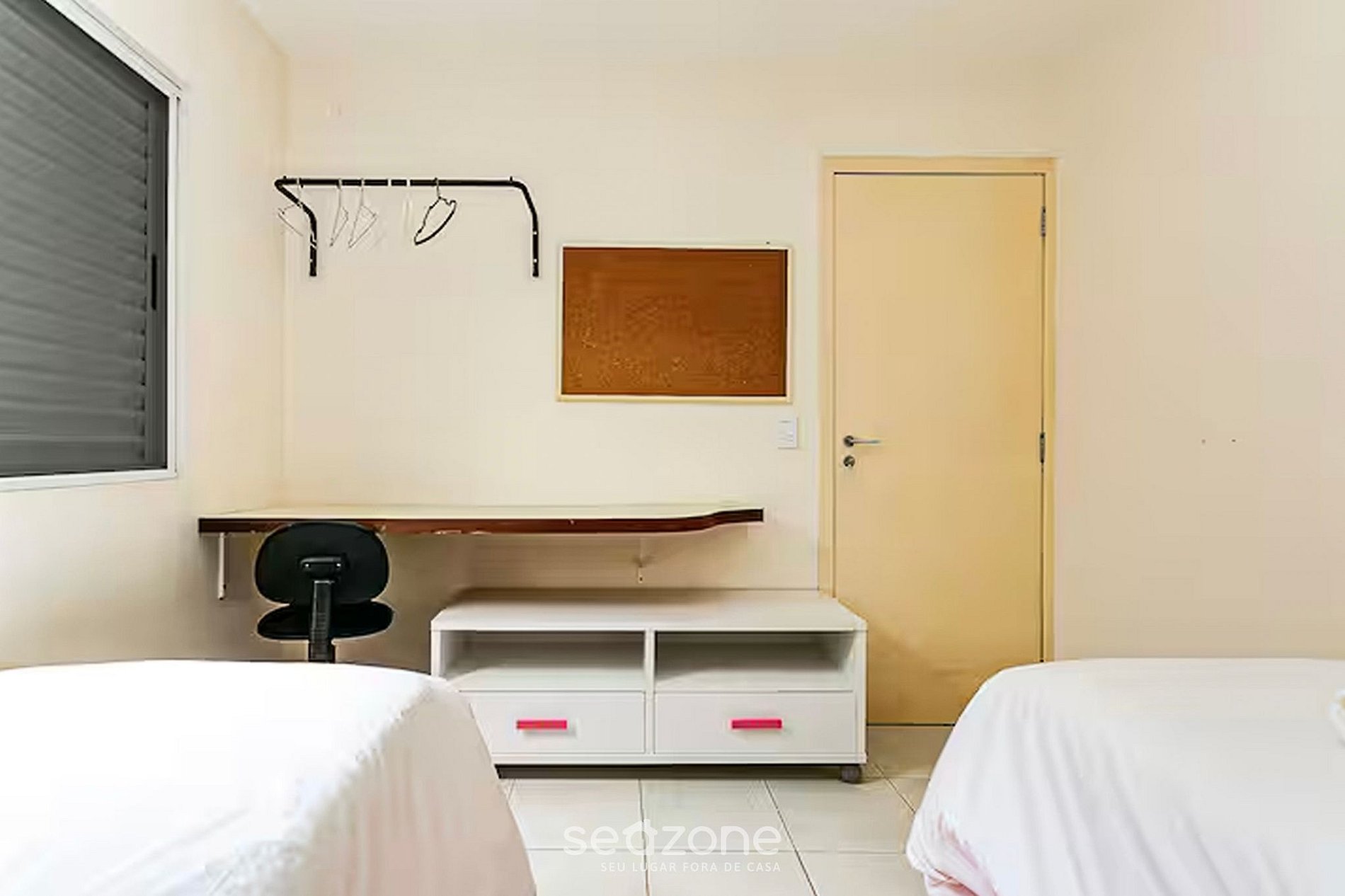 - 1 quarto com uma cama queen size (que podem ser convertidas em duas de solteiro), cômoda, cabideiro e escrivaninha;