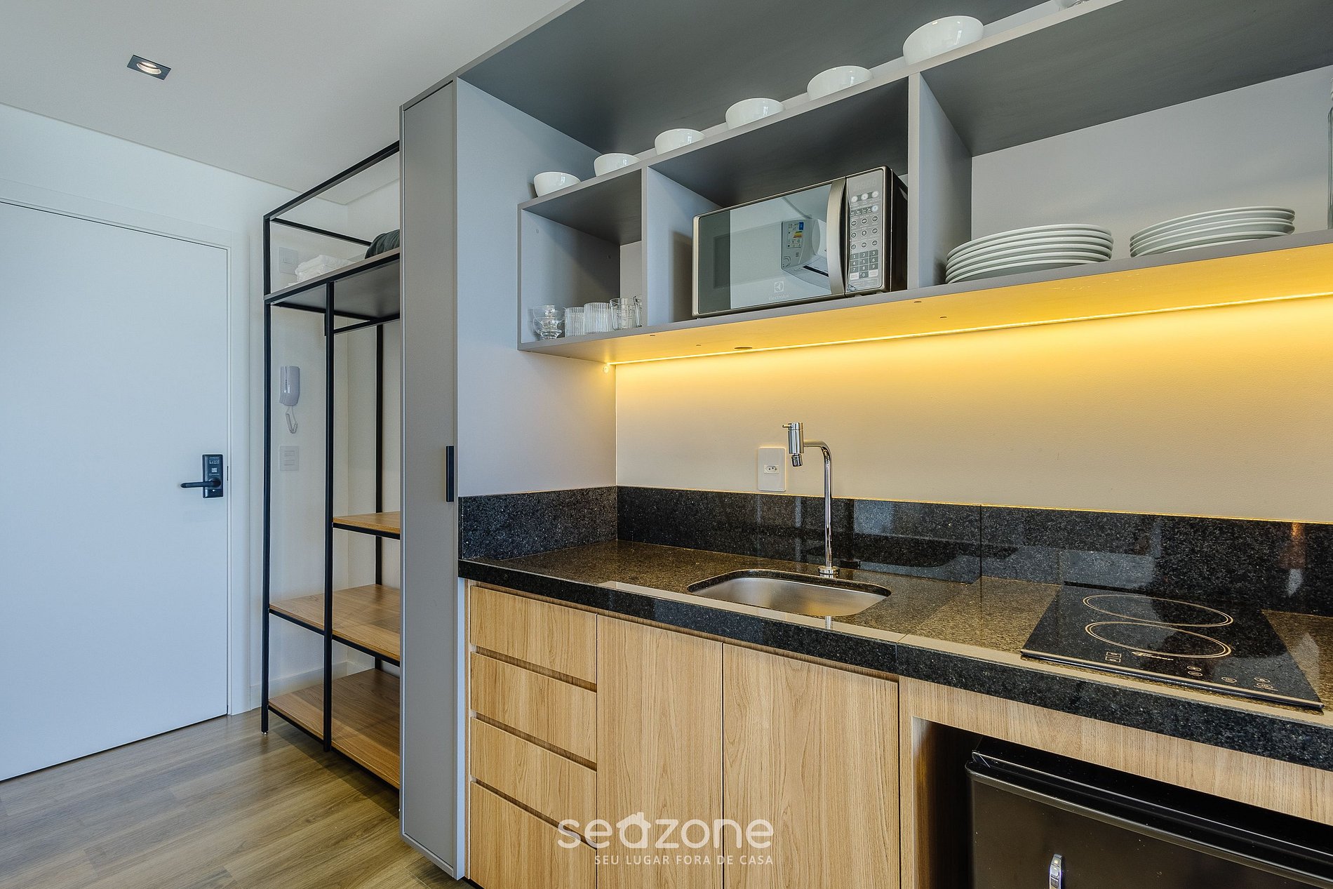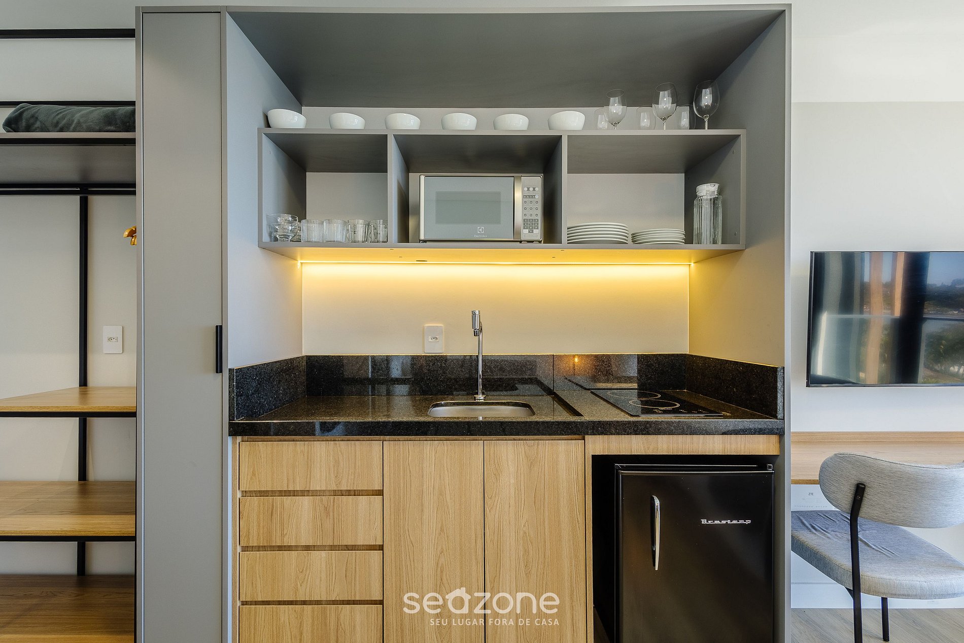- Cozinha completa com frigobar, fogão cooktop (indução), micro-ondas, sanduicheira, cafeteira elétrica, chaleira elétrica, liquidificador, taças de vinho, panelas, louças e utensílios;