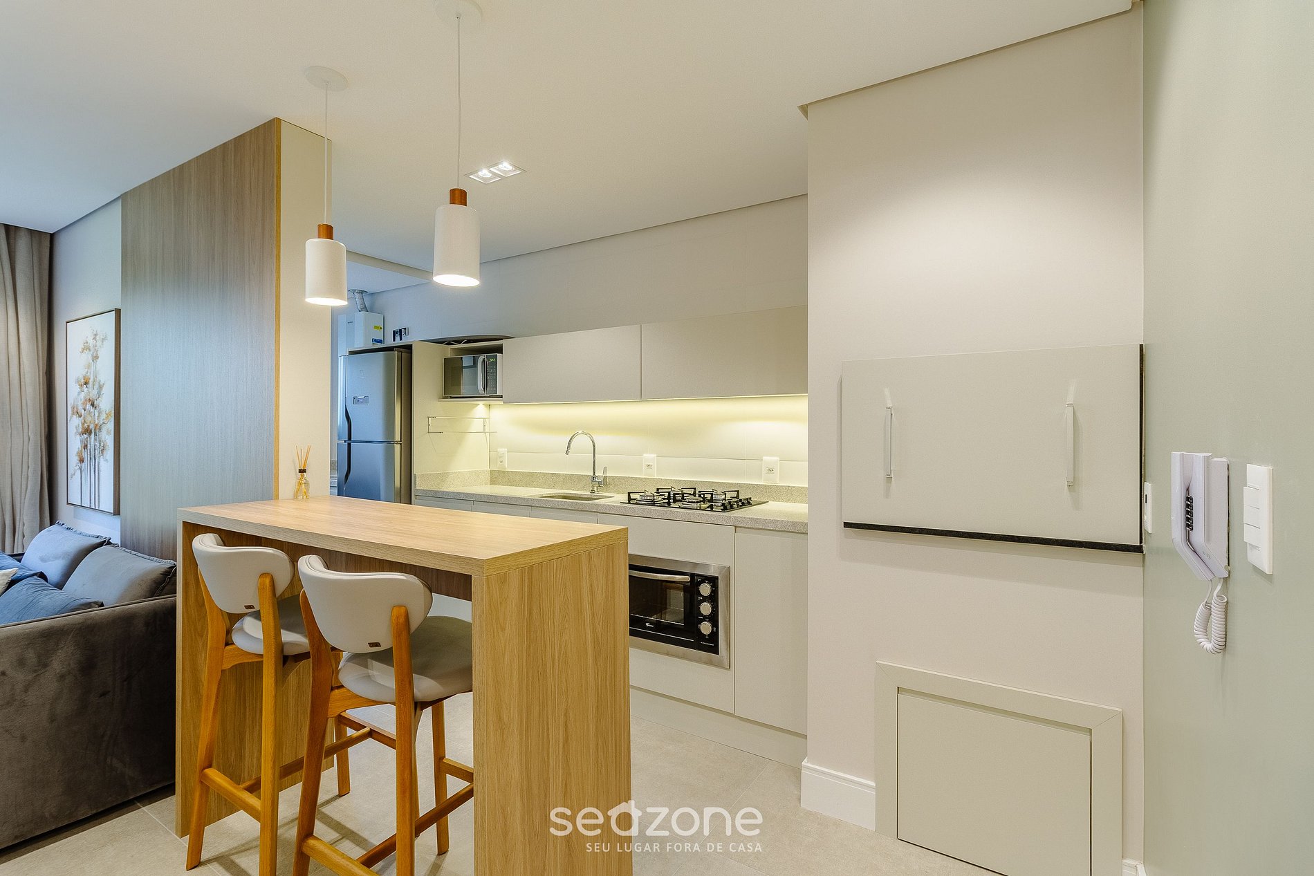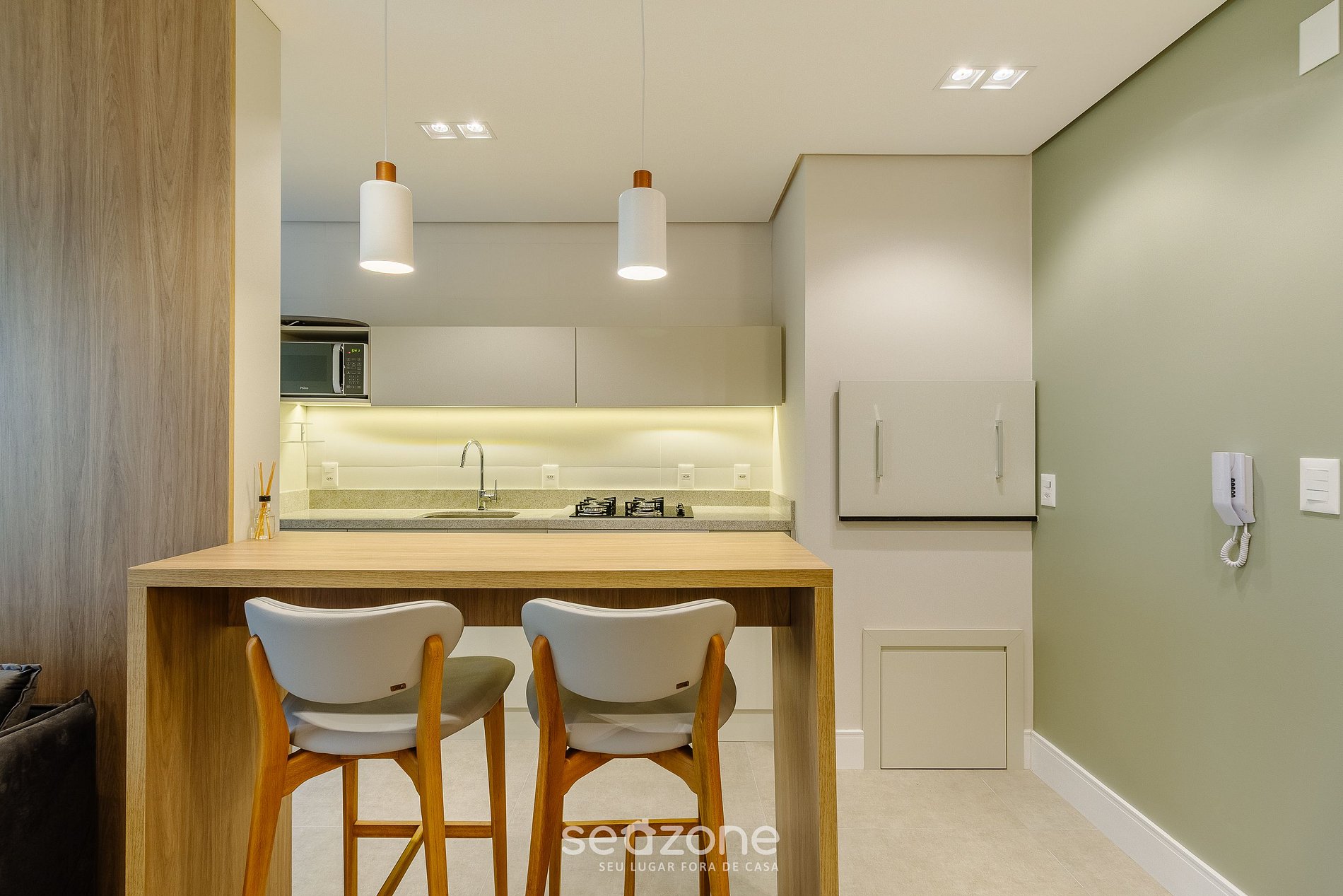 - Cozinha completa com geladeira, cooktop (à gás), forno elétrico, micro-ondas, Airfryer, sanduicheira, Kit café (suporte para filtro, garrafa térmica), chaleira elétrica, liquidificador, taças de vinho, panelas, louças e utensílios;