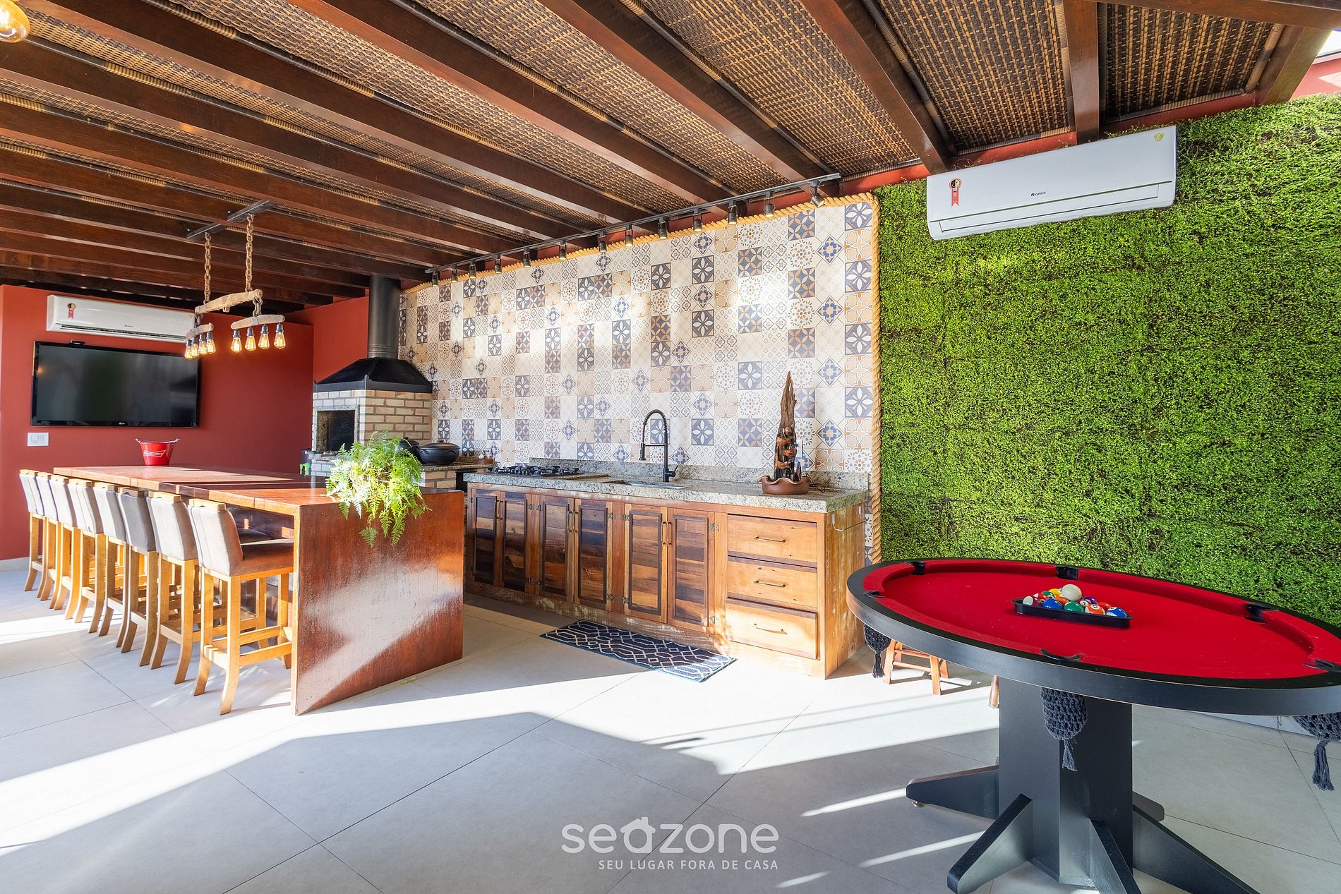 - Área gourmet com churrasqueira, Smart Tv, balcão e mesa.