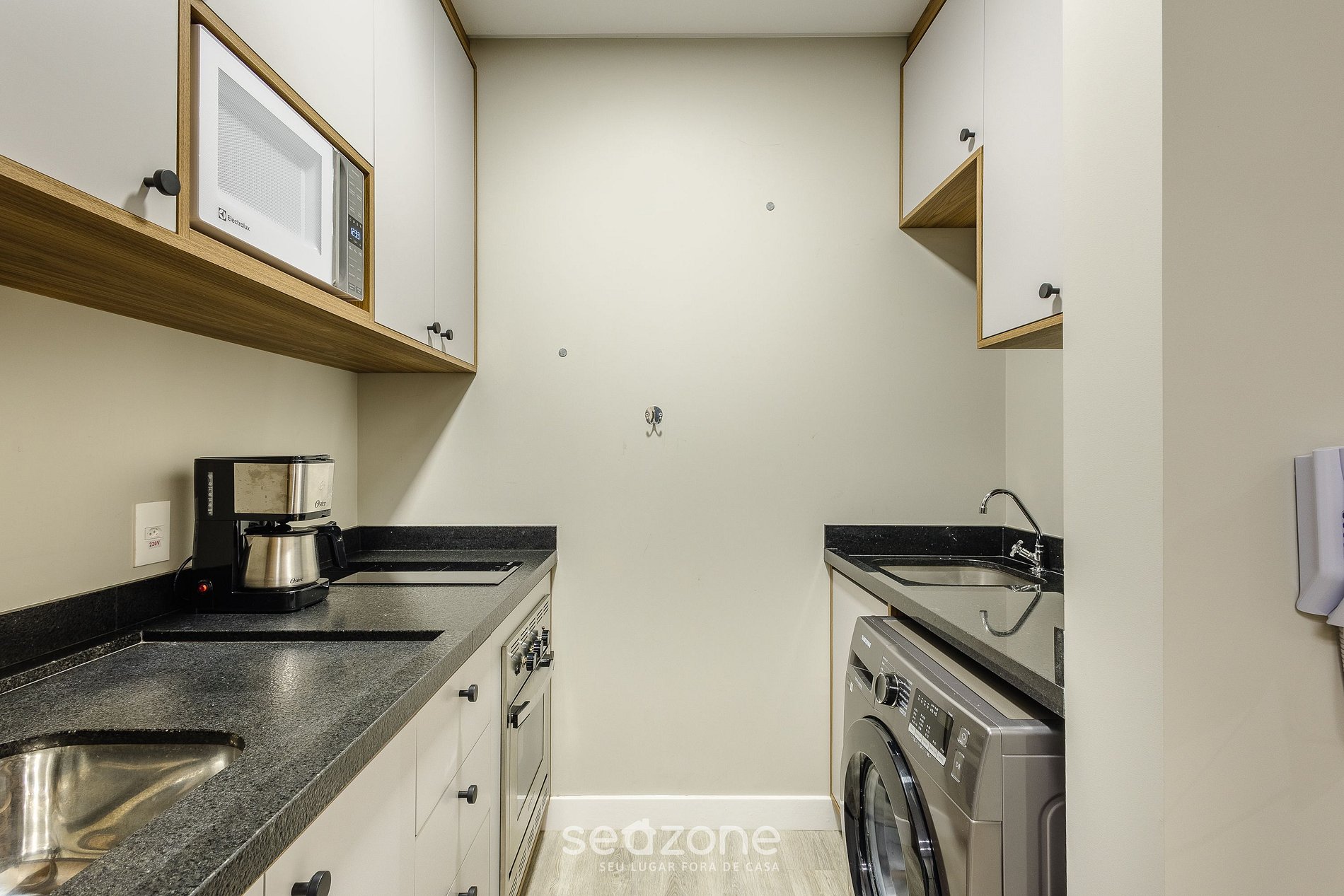 - Cozinha completa com geladeira, fogão cooktop (indução), forno elétrico, microondas, cafeteira elétrica, chaleira elétrica, taças de vinho, panelas, louças e utensílios;
