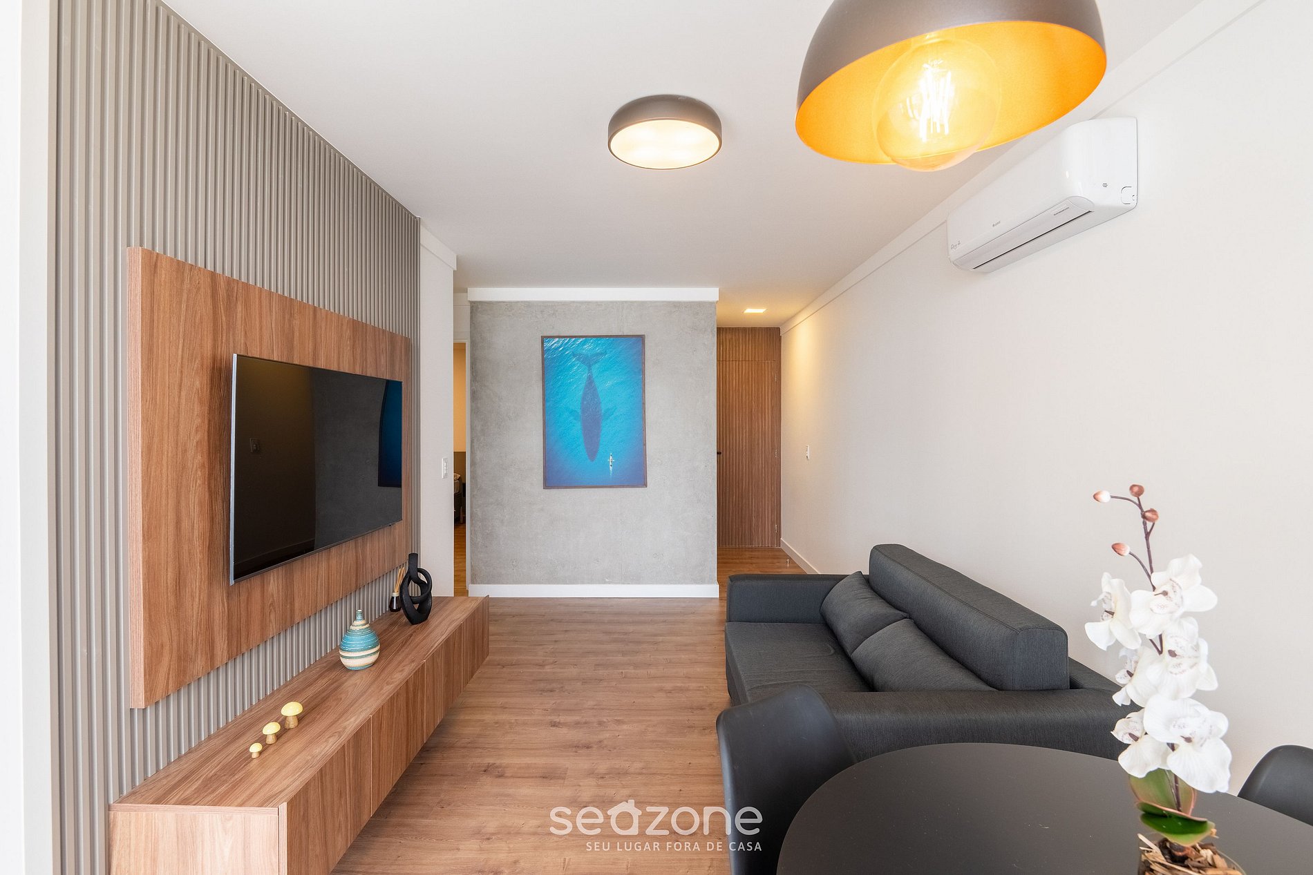 - Sala de estar com sofá-cama solteiro, Smart TV e ar-condicionado;