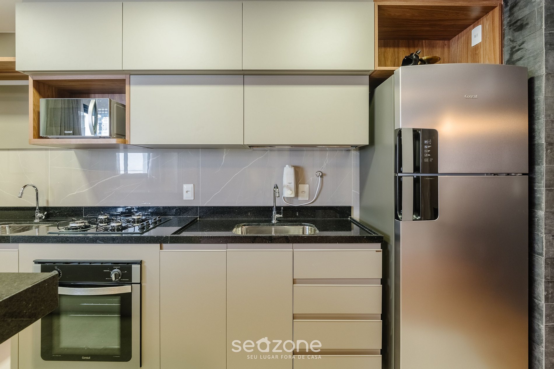 - Cozinha completa com geladeira, fogão cooktop (gás), forno elétrico, micro-ondas, liquidificador, cafeteira elétrica, chaleira (leiteira), taças de vinho, panelas, louças e utensílios;