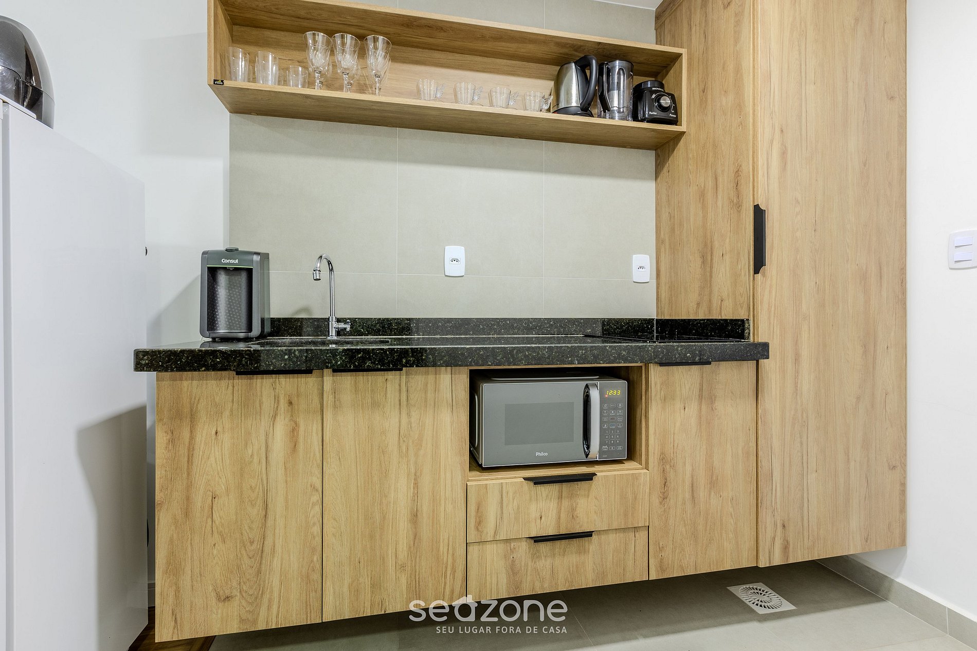 - Cozinha compacta com geladeira, fogão cooktop, micro-ondas, sanduicheira, liquidificador, panelas, louças e utensílios;