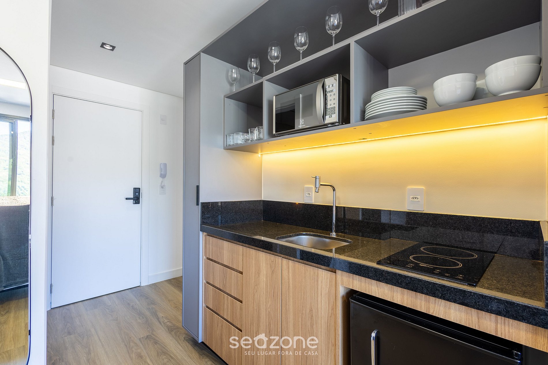 - Cozinha completa com frigobar, fogão cooktop (elétrico), micro-ondas, sanduicheira, cafeteira elétrica, chaleira, liquidificador, taças de vinho, panelas, louças e utensílios;