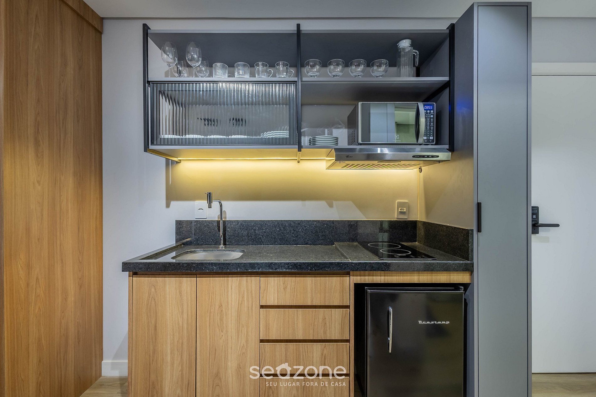 - Cozinha completa com frigobar, fogão cooktop (indução), micro-ondas, sanduicheira, cafeteira elétrica, chaleira, liquidificador, taças de vinho, panelas, louças e utensílios;