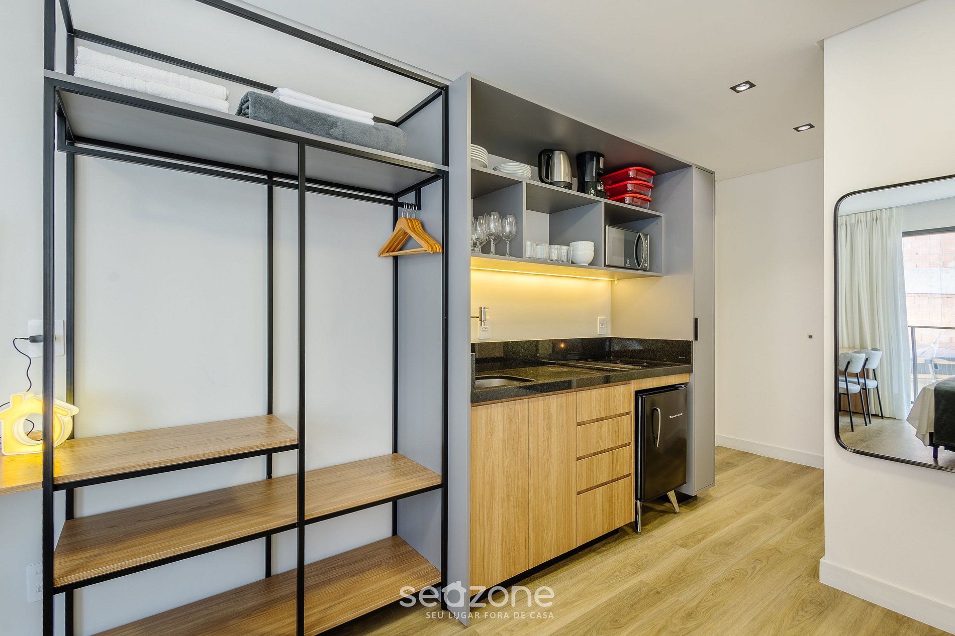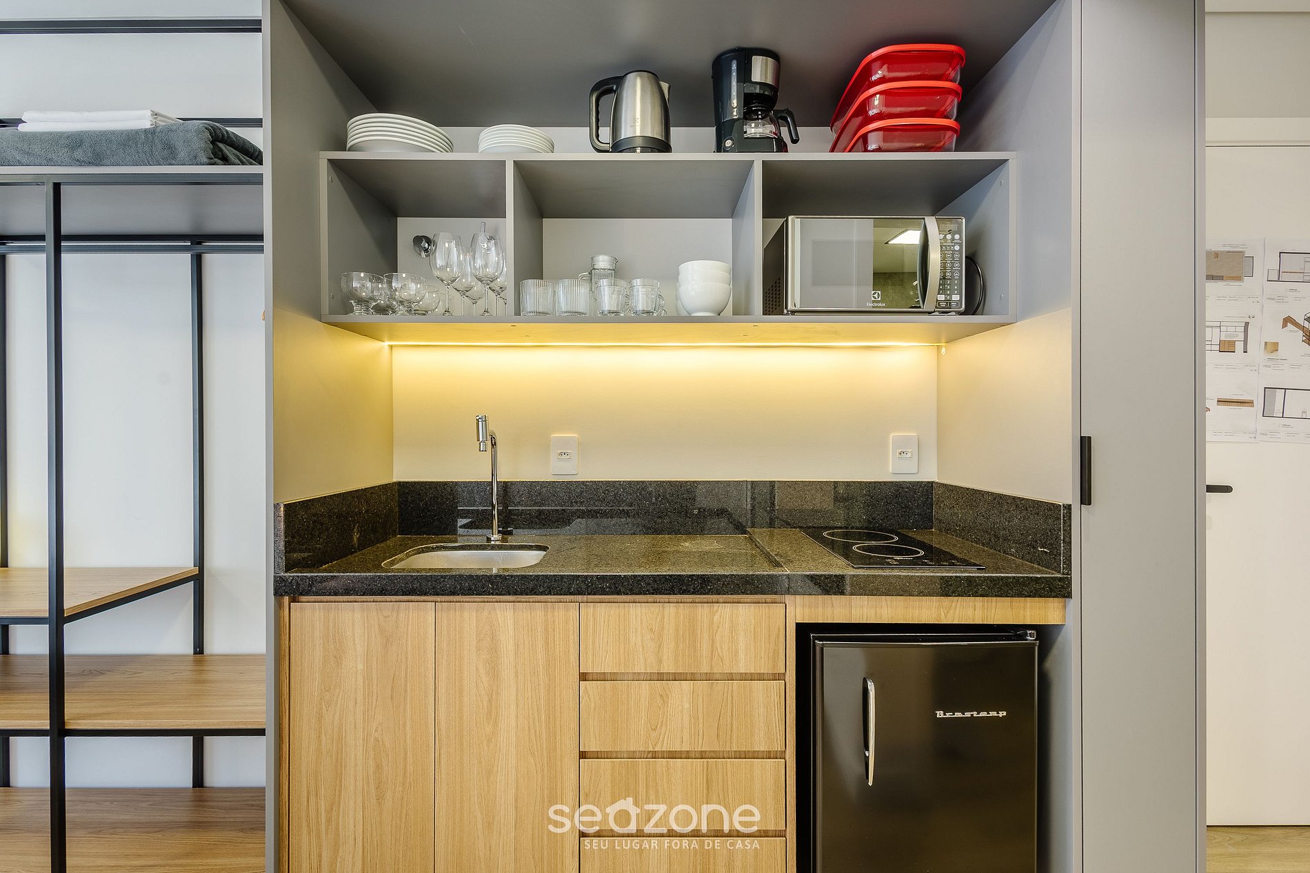 - Cozinha completa com frigobar, fogão cooktop elétrico, micro-ondas, sanduicheira, cafeteira elétrica, chaleira, liquidificador, taça de vinho, panelas, louças e utensílios;
