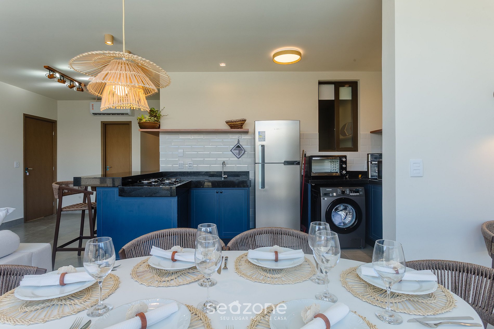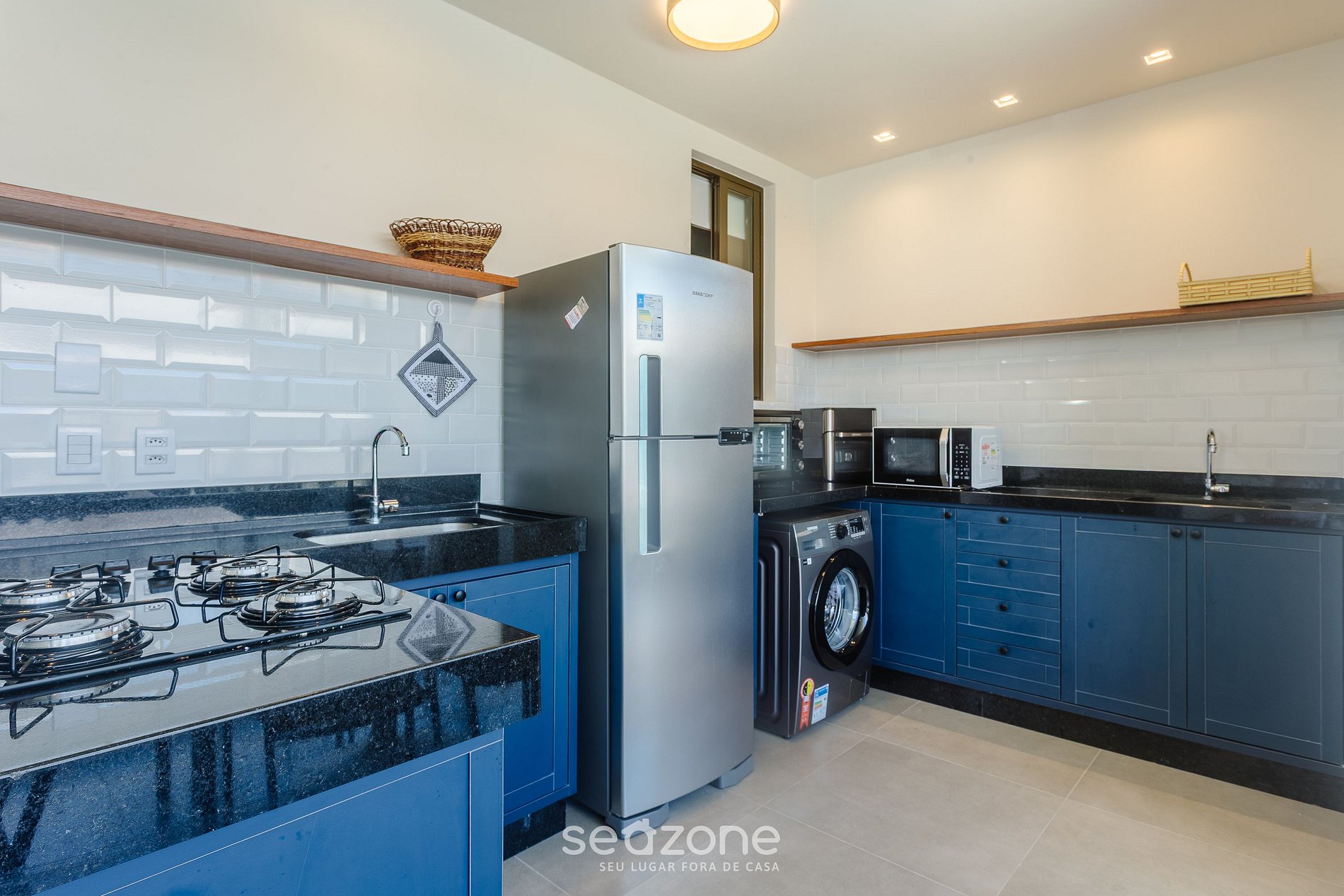 - Cozinha completa com geladeira, fogão cooktop (gás), forno elétrico, microondas, Airfryer, sanduicheira, cafeteira elétrica, chaleira comum, liquidificador, taças de vinho, panelas, louças e utensílios;