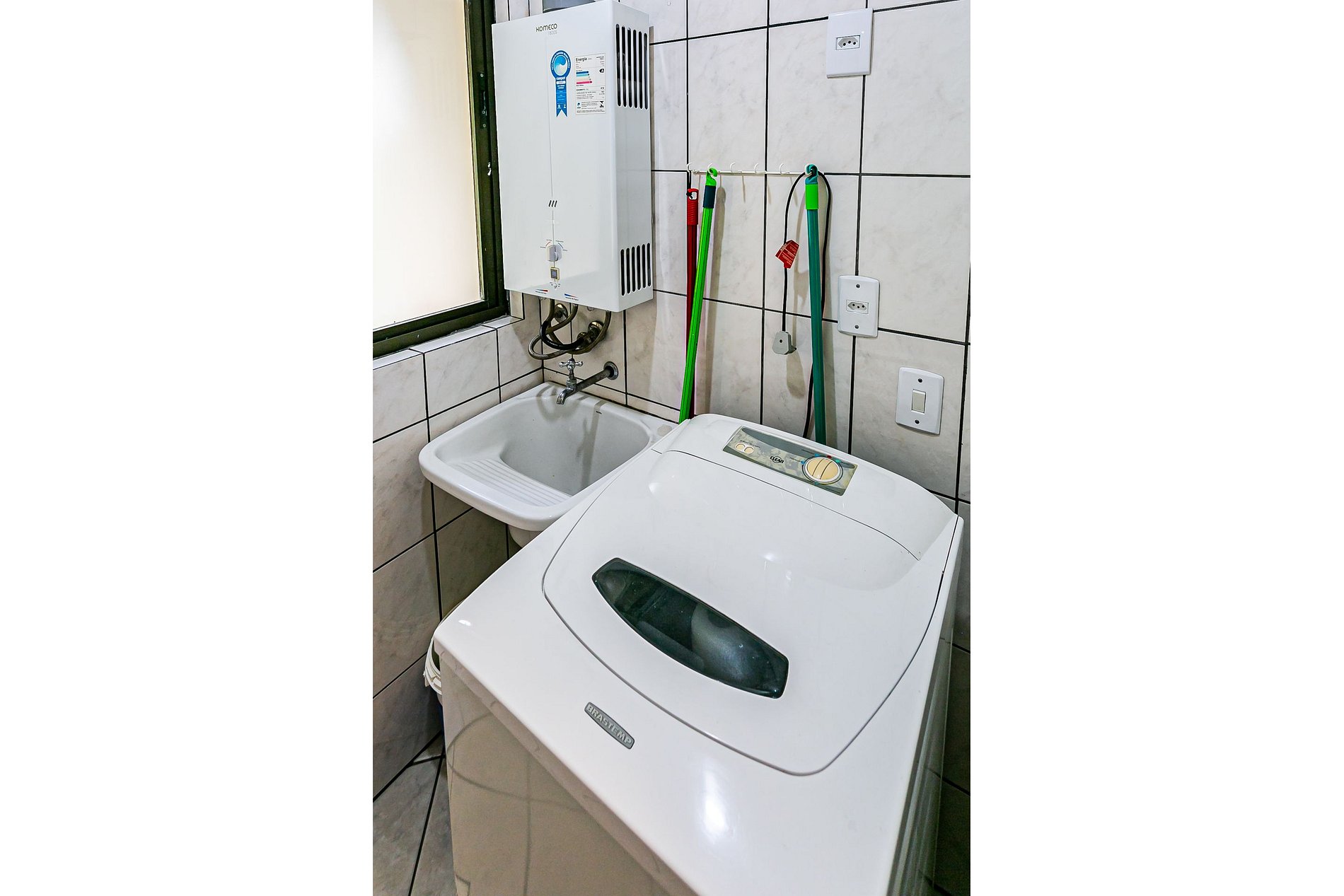 - Área de serviço com máquina de lavar, tanque e varal;