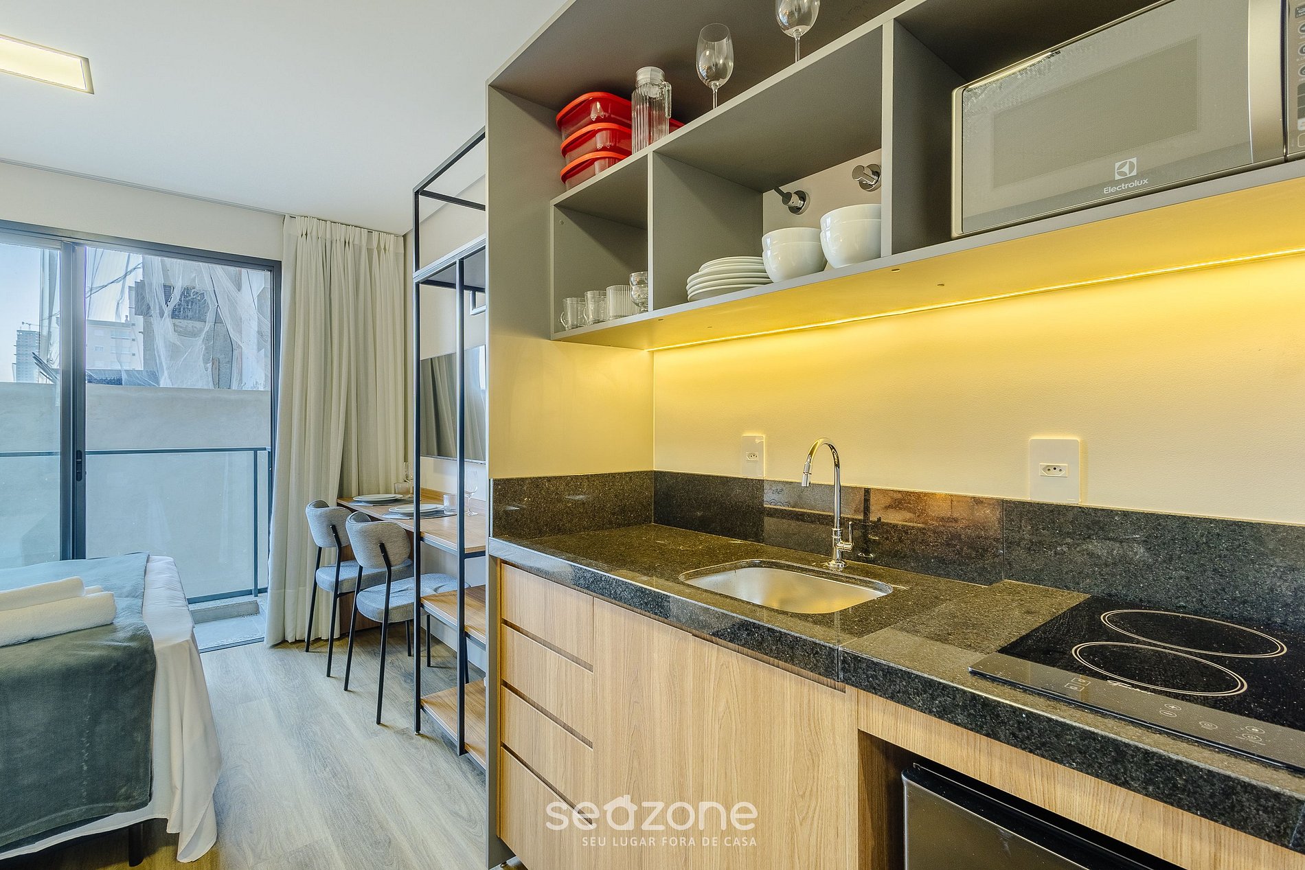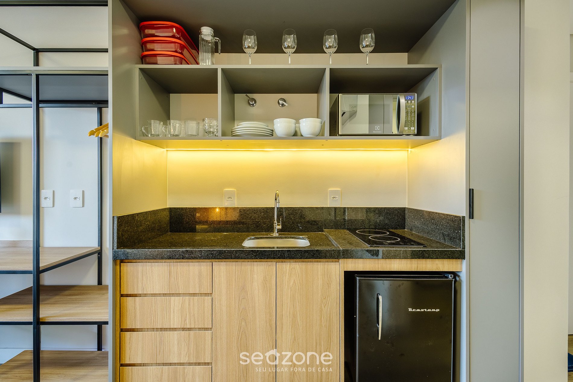 - Cozinha completa com frigobar, fogão cooktop (elétrico), microondas, sanduicheira, cafeteira elétrica, chaleira, liquidificador, taças de vinho, panelas, louças e utensílios;