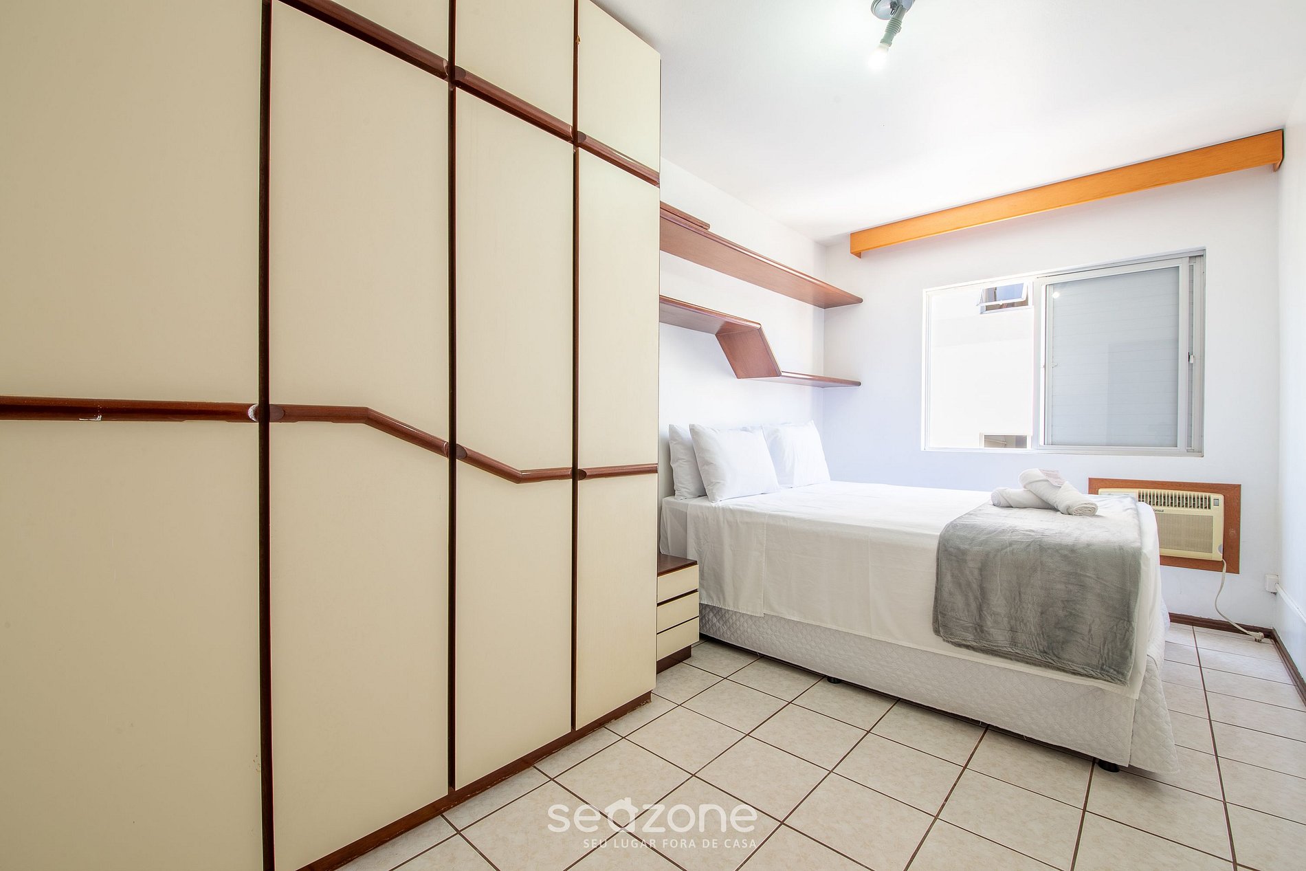 - 1 Quarto com cama de casal queen size, armário e ar condicionado;
