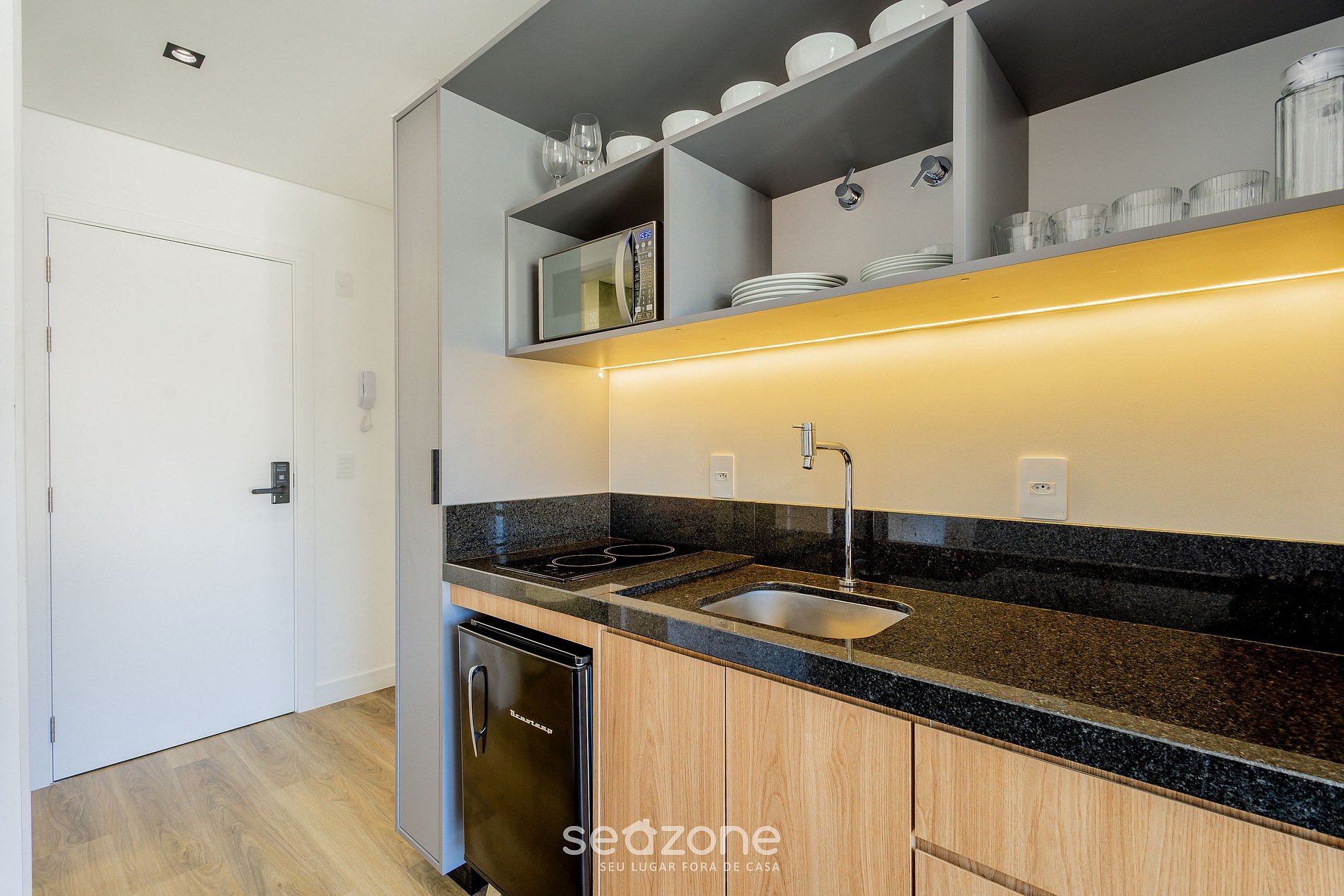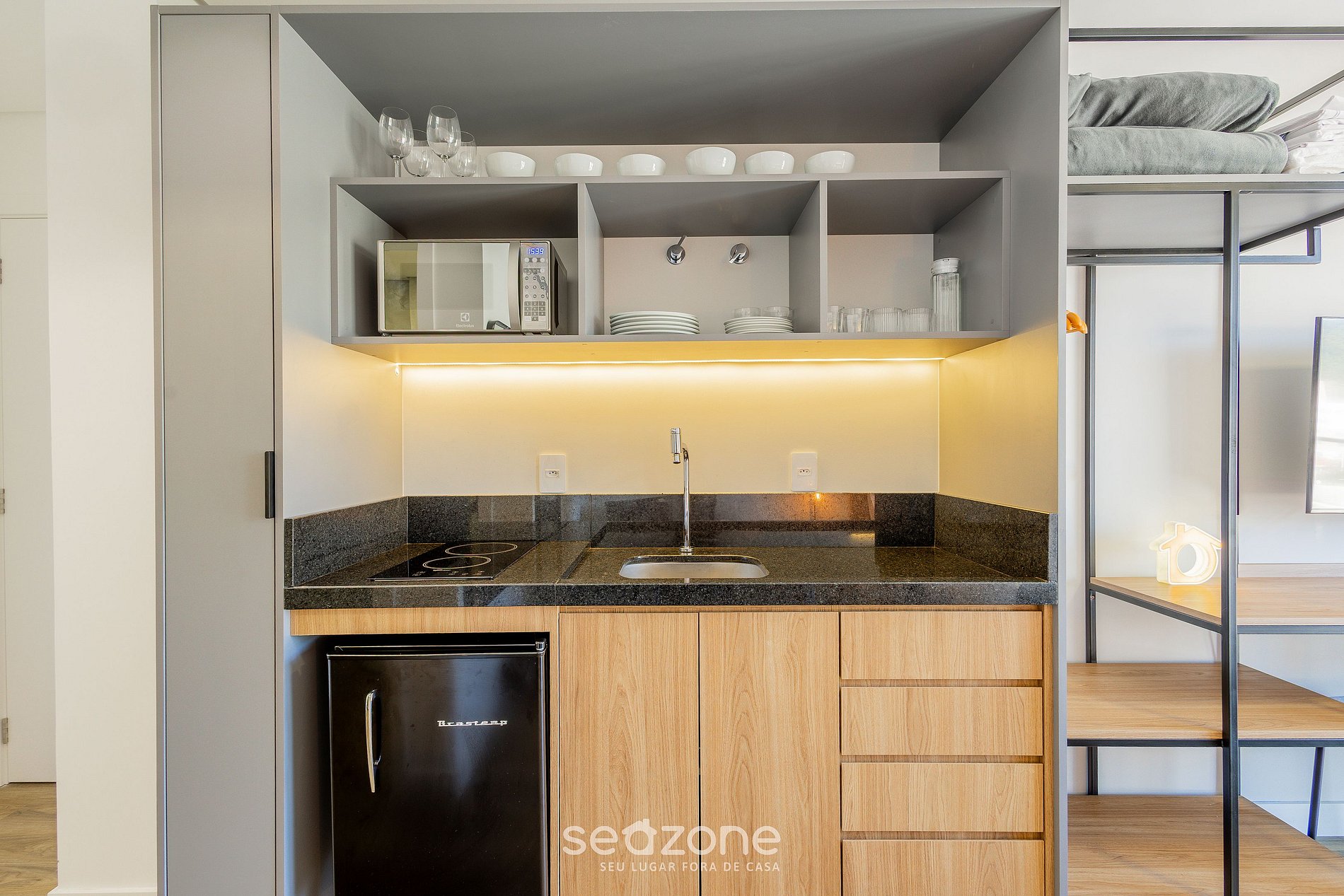 - Cozinha completa com frigobar, fogão cooktop (elétrico), microondas, sanduicheira, cafeteira elétrica, chaleira elétrica, liquidificador, taças de vinho, panelas, louças e utensílios;