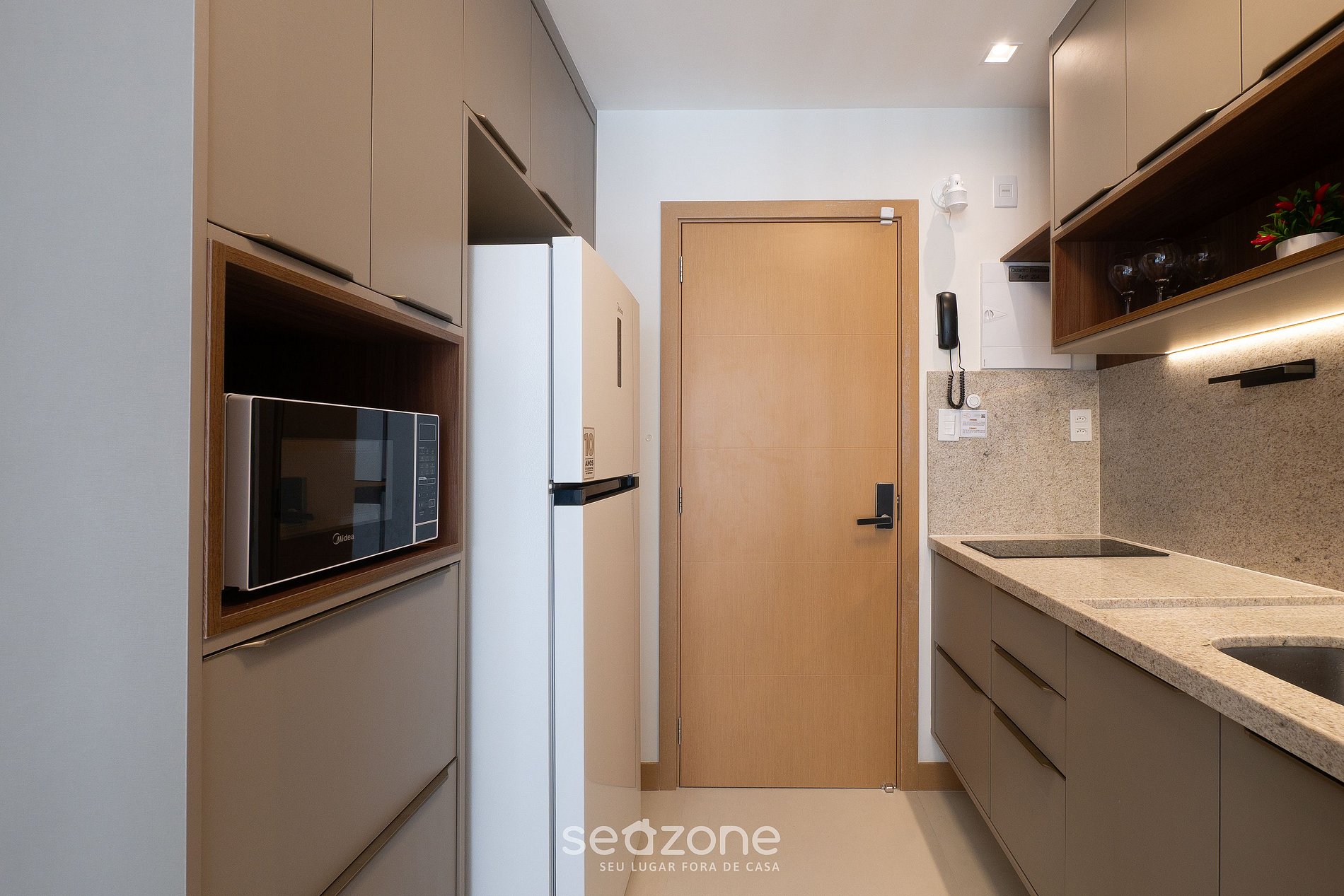 - Cozinha completa com geladeira, fogão a gás, cooktop elétrico, forno, micro-ondas, sanduicheira, cafeteira elétrica, chaleira, liquidificador.