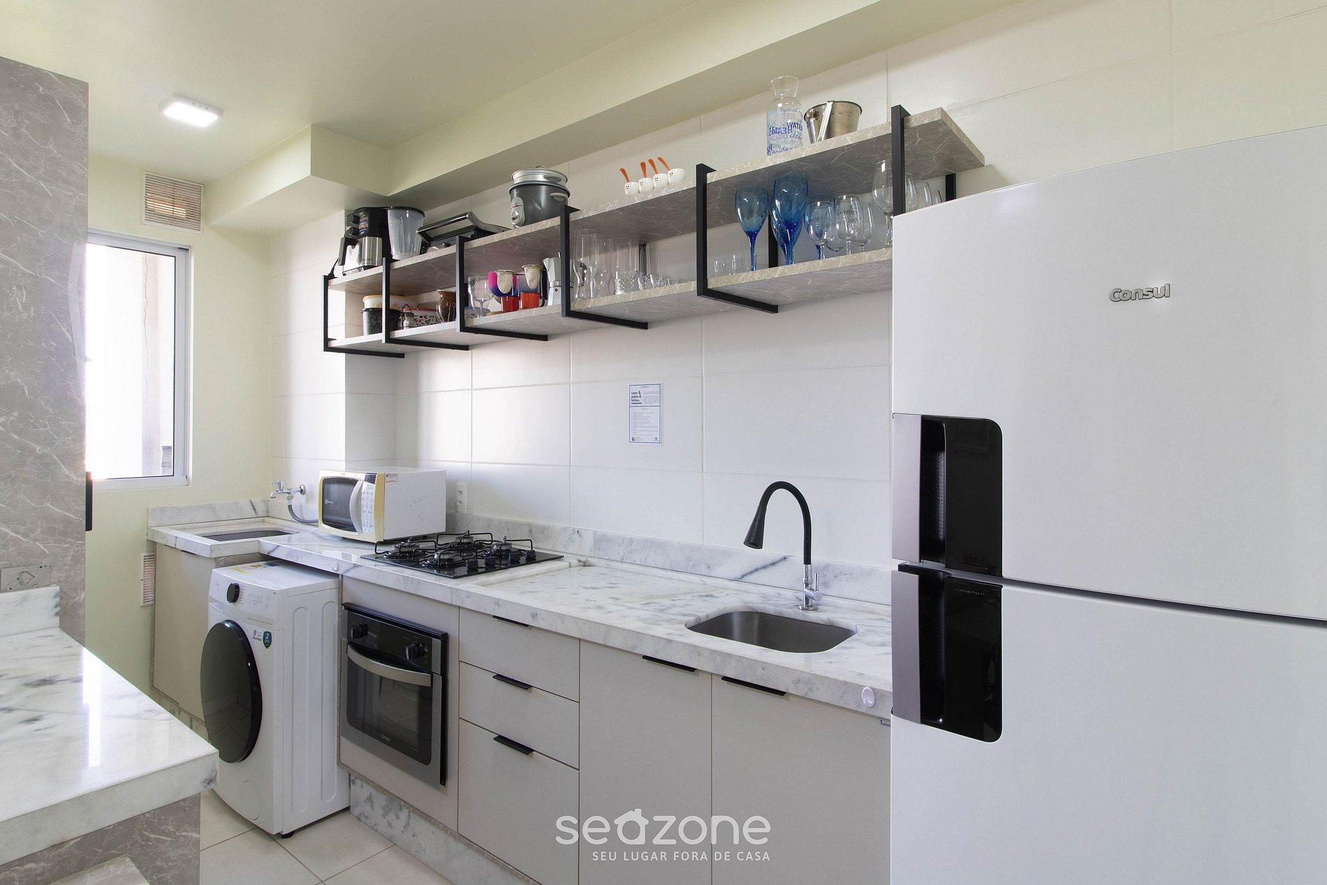 - Cozinha completa com geladeira, fogão cooktop, forno elétrico, airfryer, micro-ondas, sanduicheira, Kit café (suporte para filtro, garrafa térmica), chaleira elétrica, liquidificador, taças de vinho, panelas, louças e utensílios;