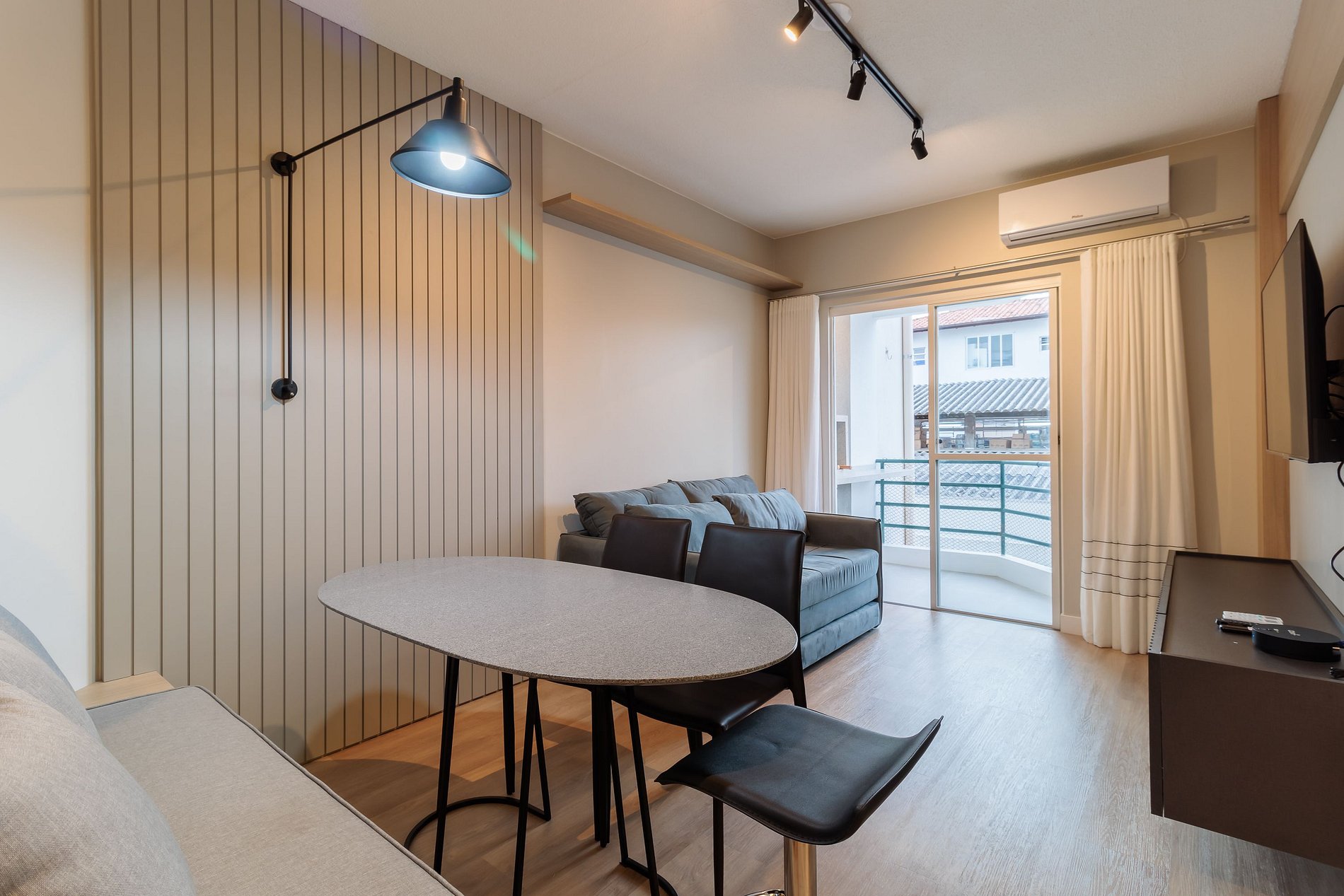 - Sala de estar e jantar integradas com, sofá-cama, TV, ar-condicionado e mesa de jantar com cadeiras e banco;