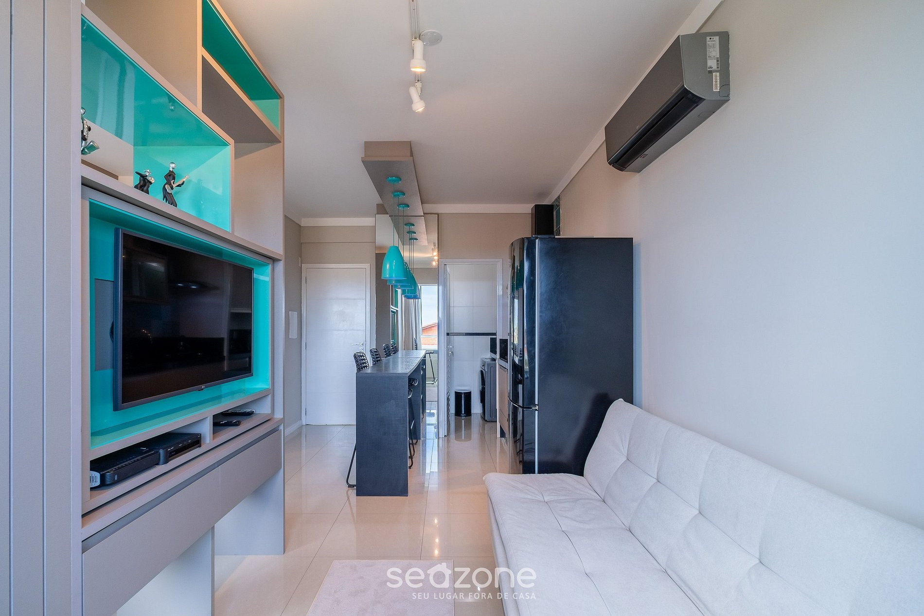 - 1 cama de casal, sofá, armário, smart TV e ar-condicionado;
