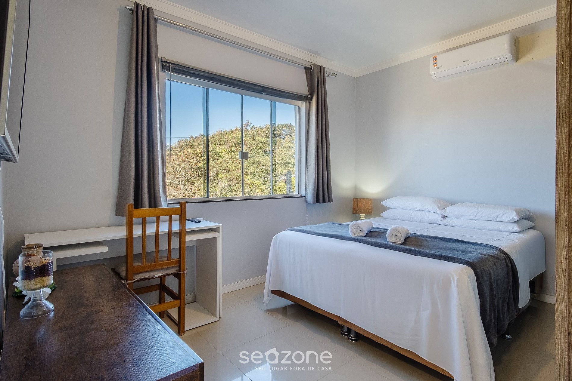 - 1 Quarto com cama queen, armário, smart TV, ventilador portátil e ar-condicionado;