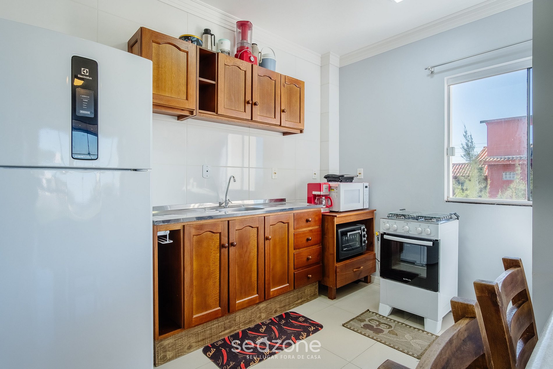 - Cozinha completa com geladeira, fogão e forno a gás, micro-ondas, sanduicheira, cafeteira elétrica, chaleira, liquidificador, taças de vinho, panelas, louças e utensílios;