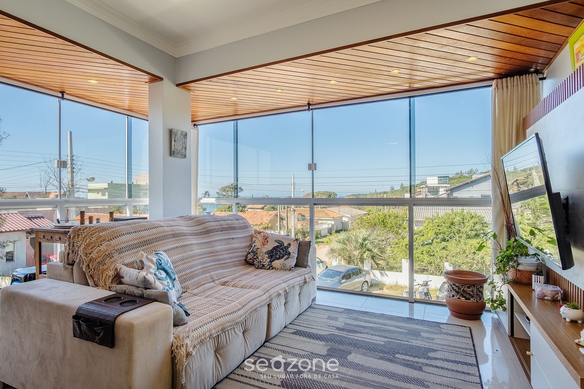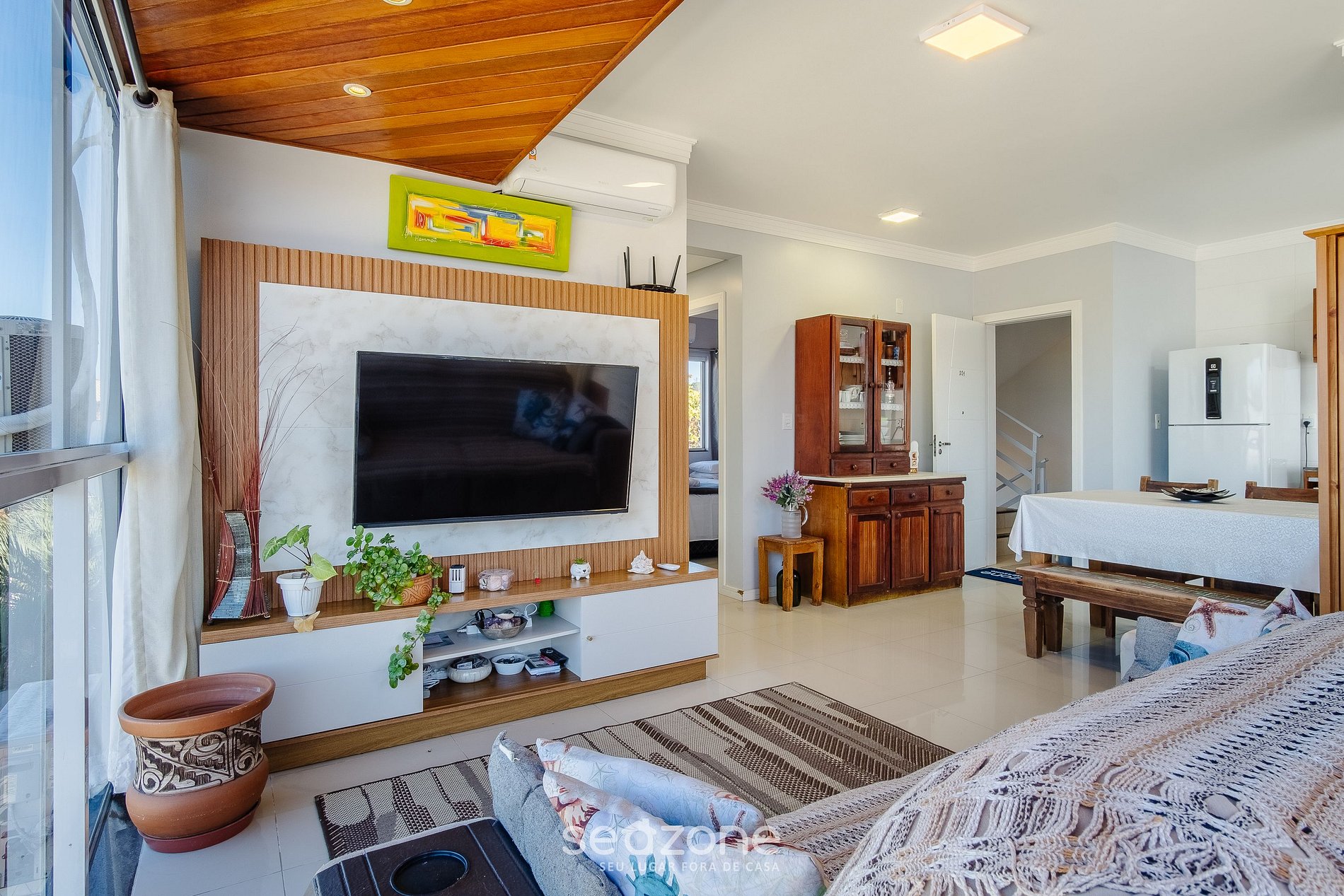 - Sala de estar com sofá, Smart TV e ar-condicionado;