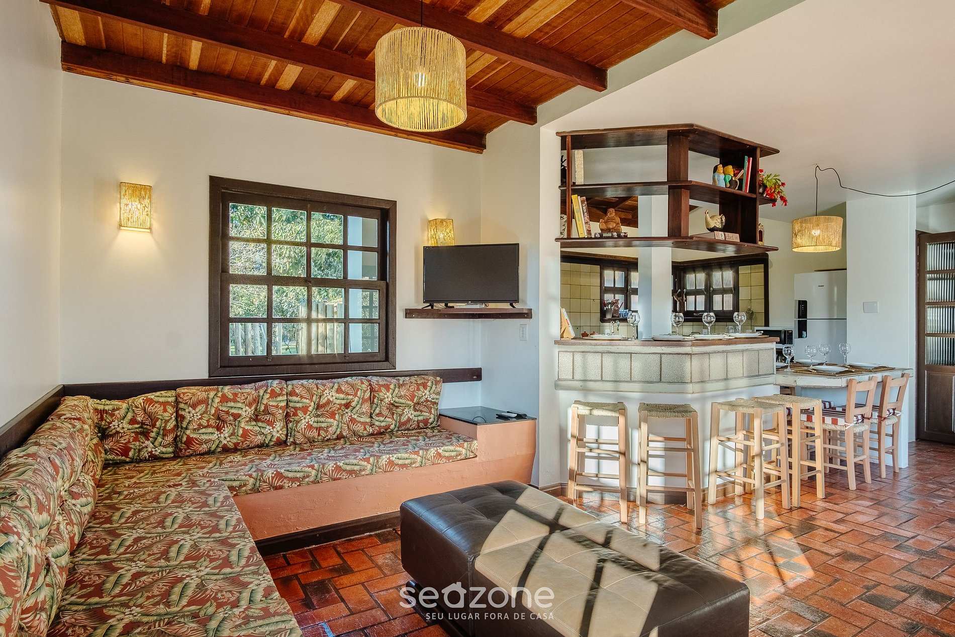 - Sala de estar com sofá, Smart TV e ar-condicionado;