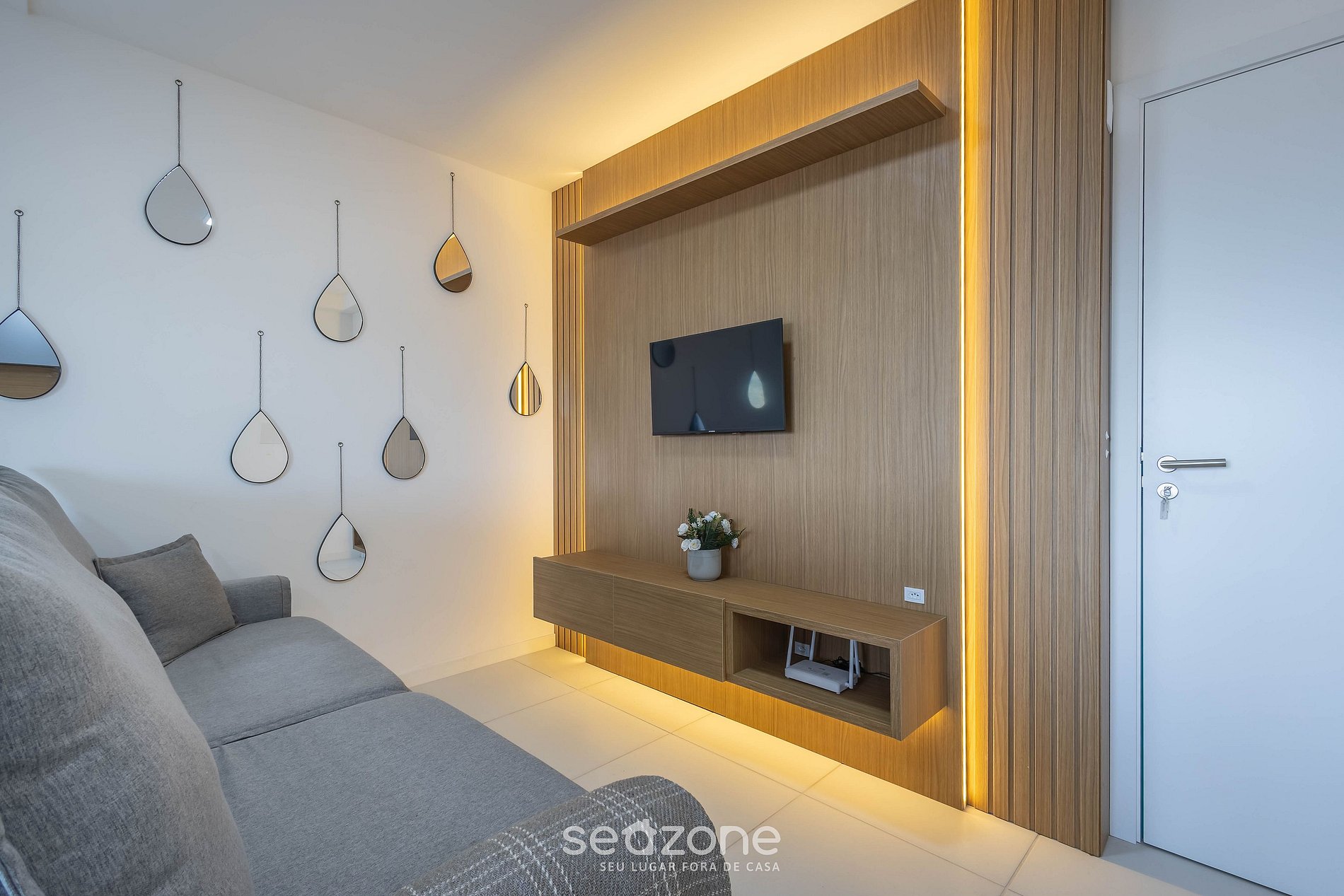 - Sala de estar com sofá-cama, Smart TV e ar-condicionado;