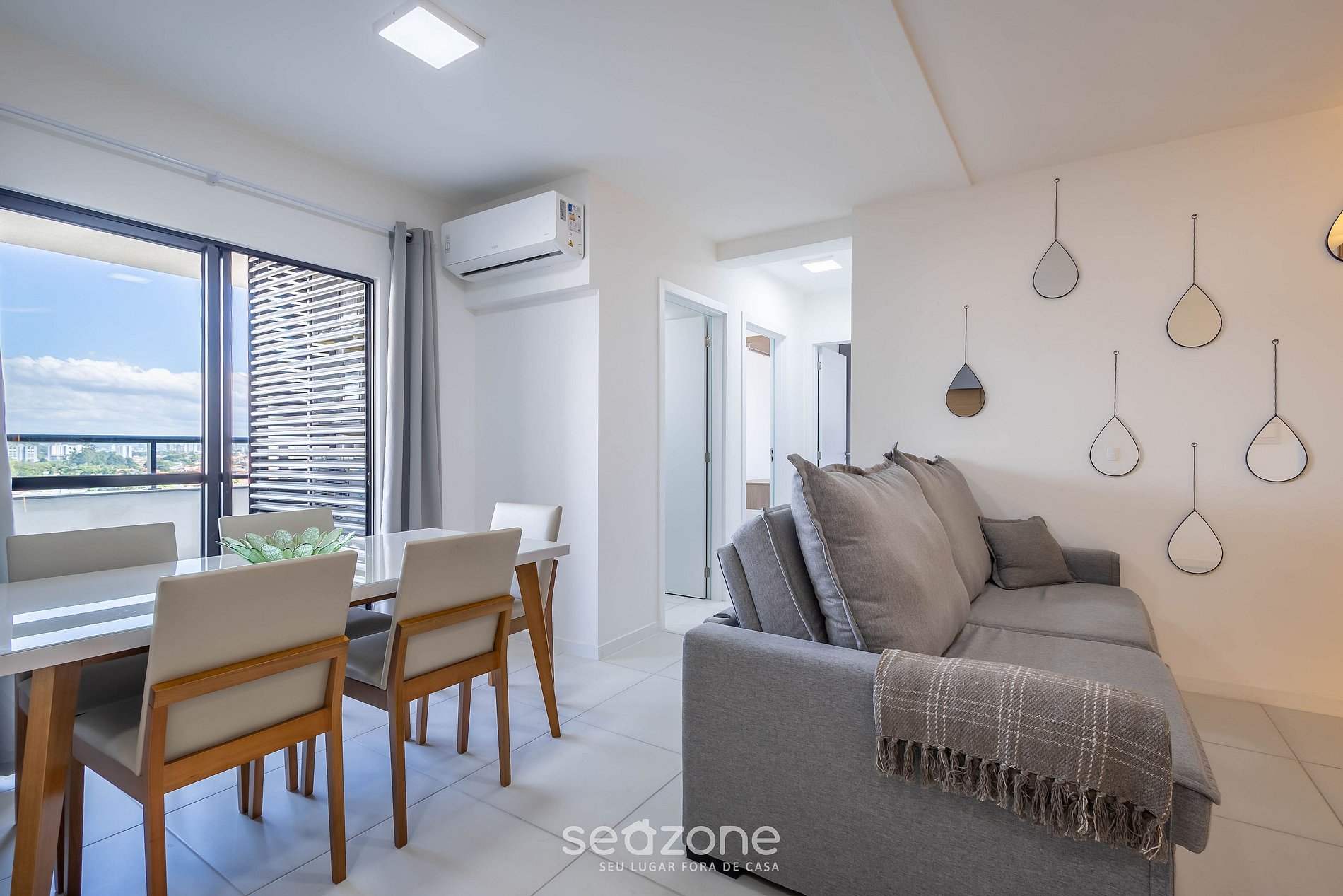 - Sala de estar com sofá-cama, Smart TV e ar-condicionado;