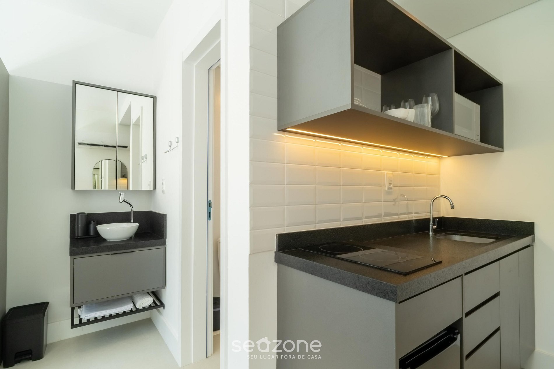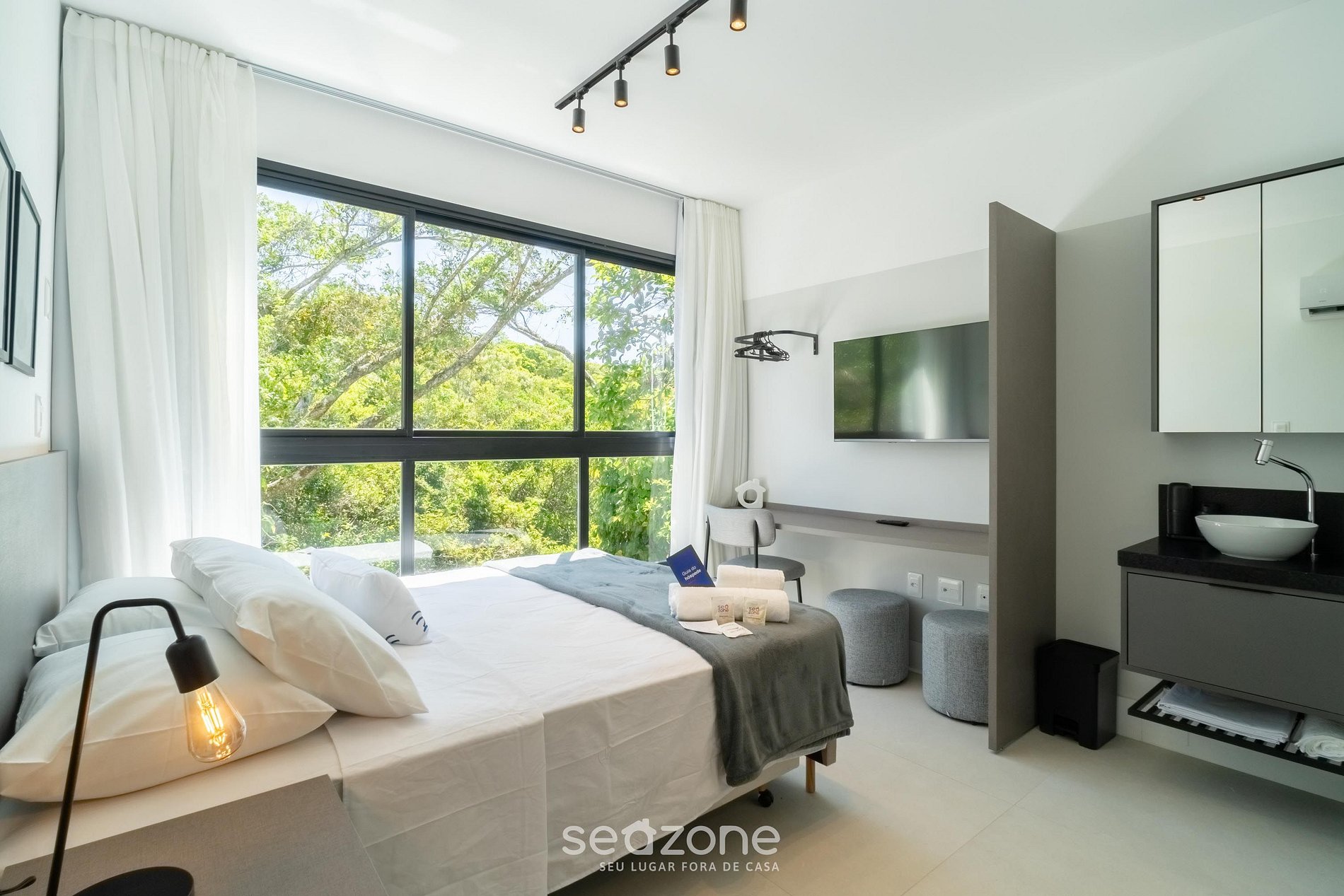 Este studio moderno oferece cama queen, Smart TV, ar-condicionado, cozinha completa e área de jantar/trabalho integrada. A ampla iluminação natural e a vista verde trazem leveza ao ambiente. Nas áreas comuns, piscina e rooftop elevam a experiência. A poucos passos da Lagoa da Conceição, com fácil acesso ao centrinho, cafés e praias como Joaquina e Mole.