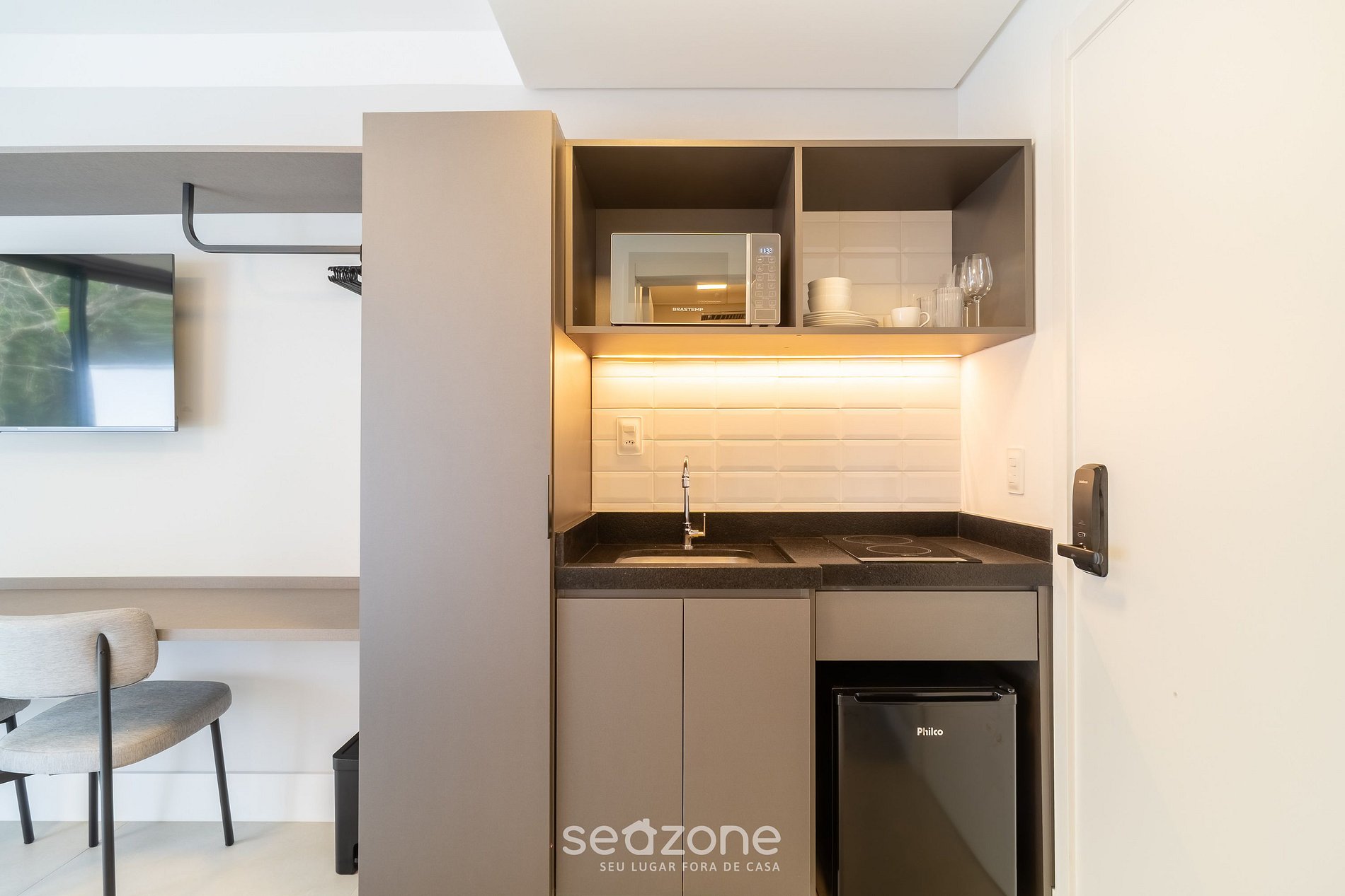 - Cozinha completa com frigobar, fogão cooktop (elétrico), micro-ondas, sanduicheira, cafeteira elétrica, chaleira, liquidificador, taças de vinho, panelas, louças e utensílios;