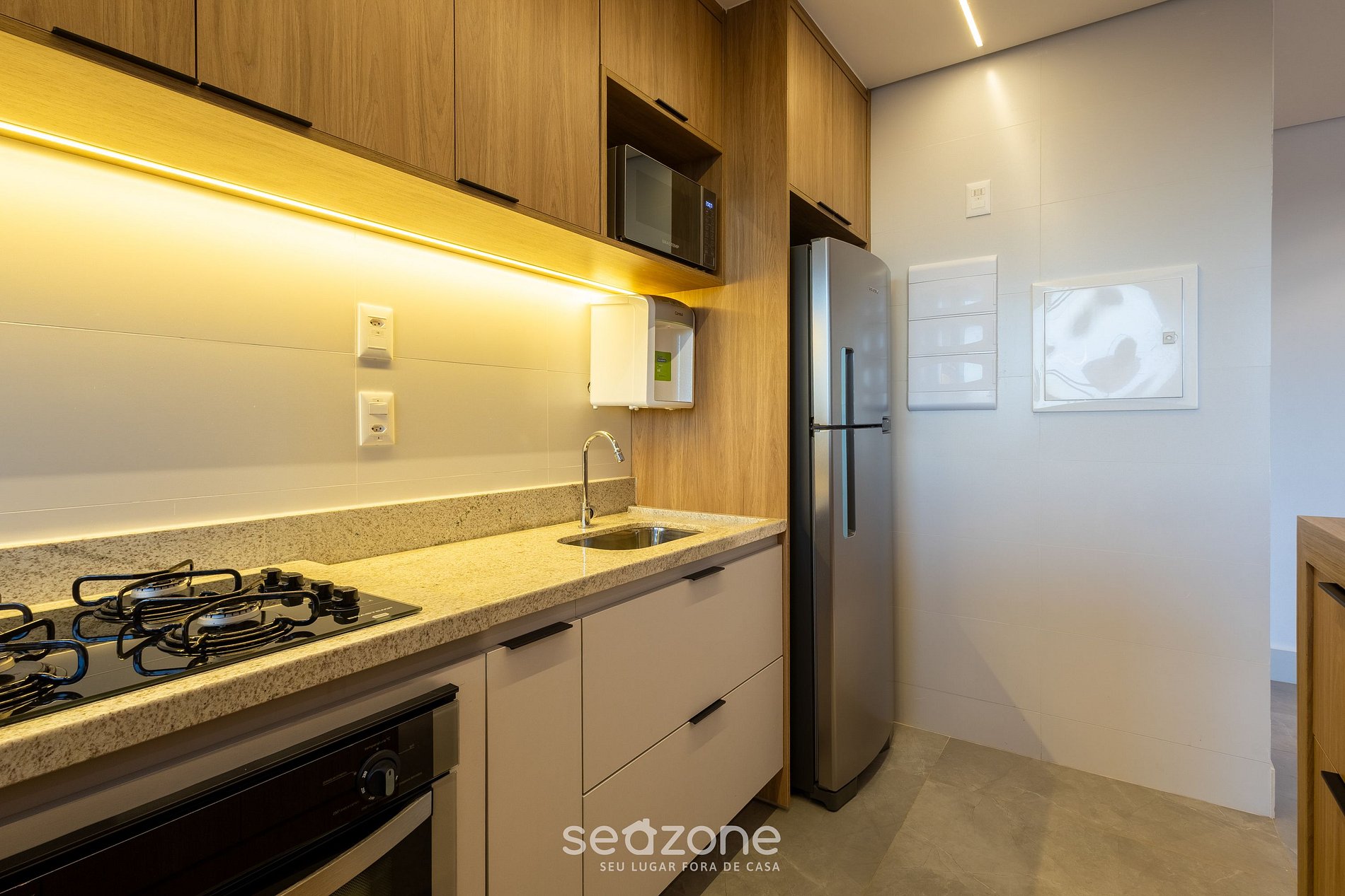 - Cozinha completa com geladeira, fogão cooktop, forno à gás, micro-ondas, sanduicheira, chaleira elétrica, louças e utensílios;