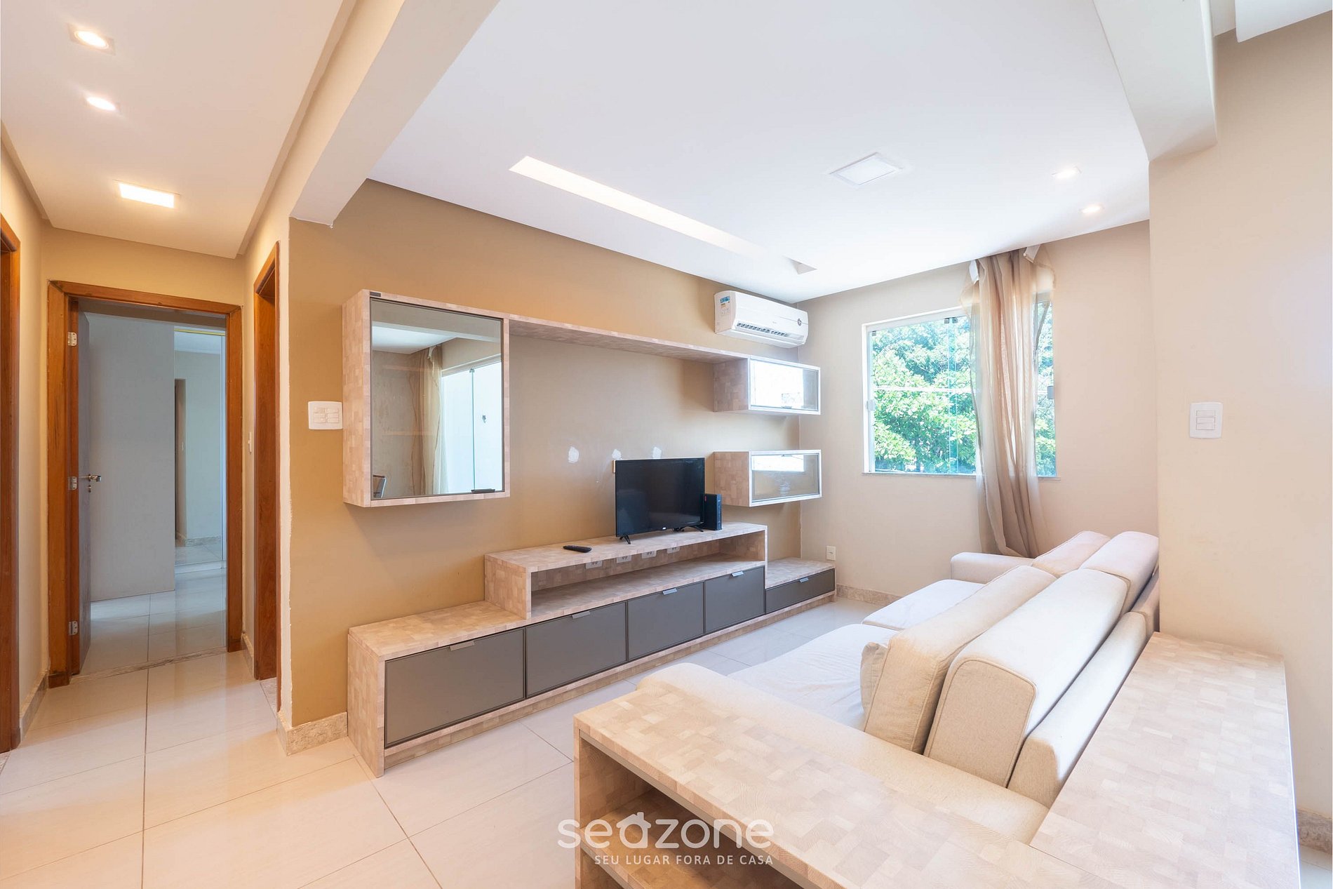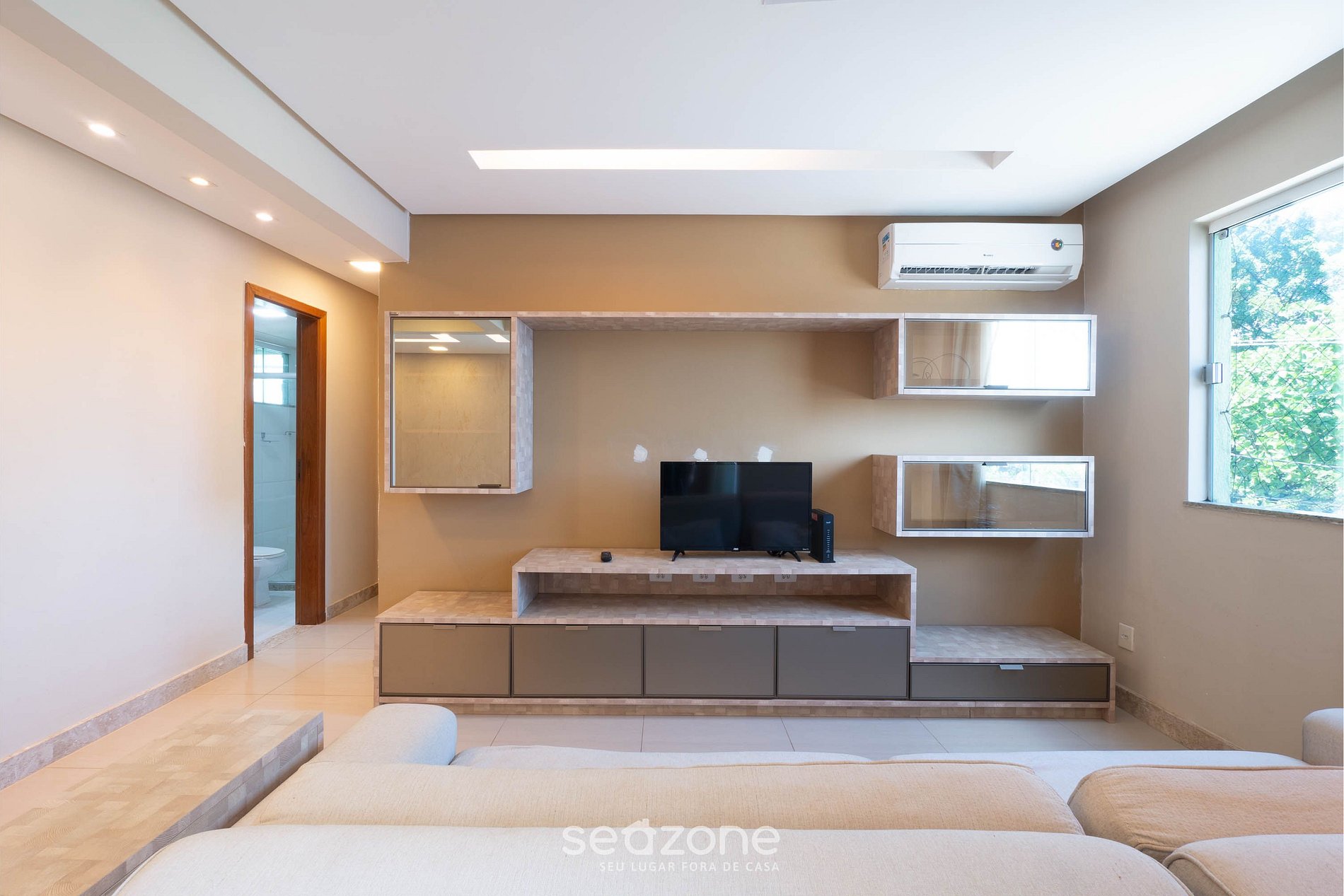- Espaço com sofá, Smart TV e ar-condicionado;