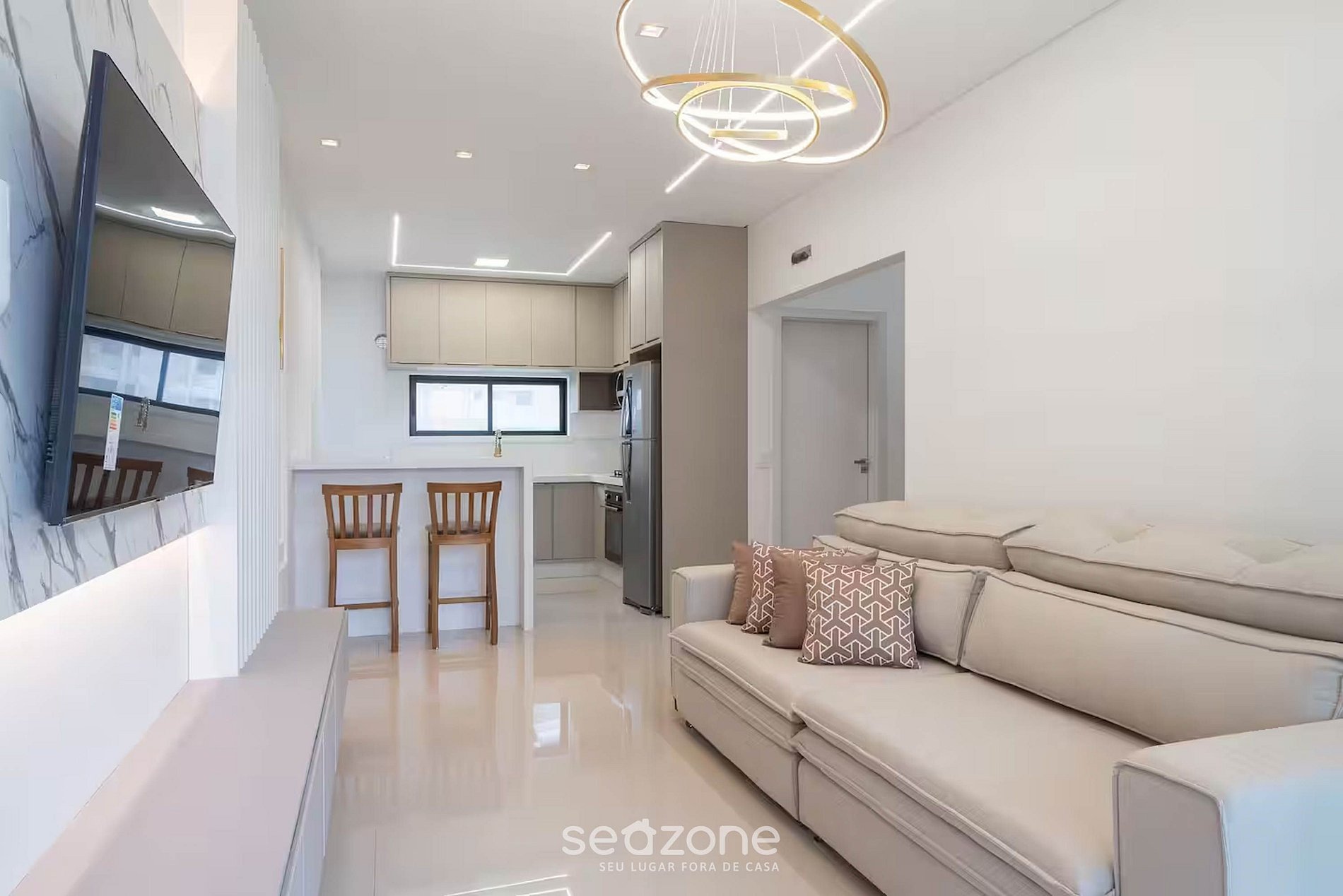 - Sala de estar com sofá e Smart TV de tela plana;