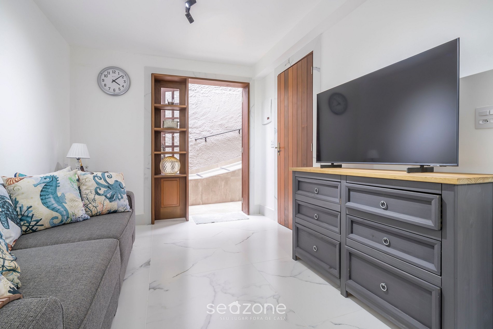 - Sala de estar com sofá e smart TV de tela plana