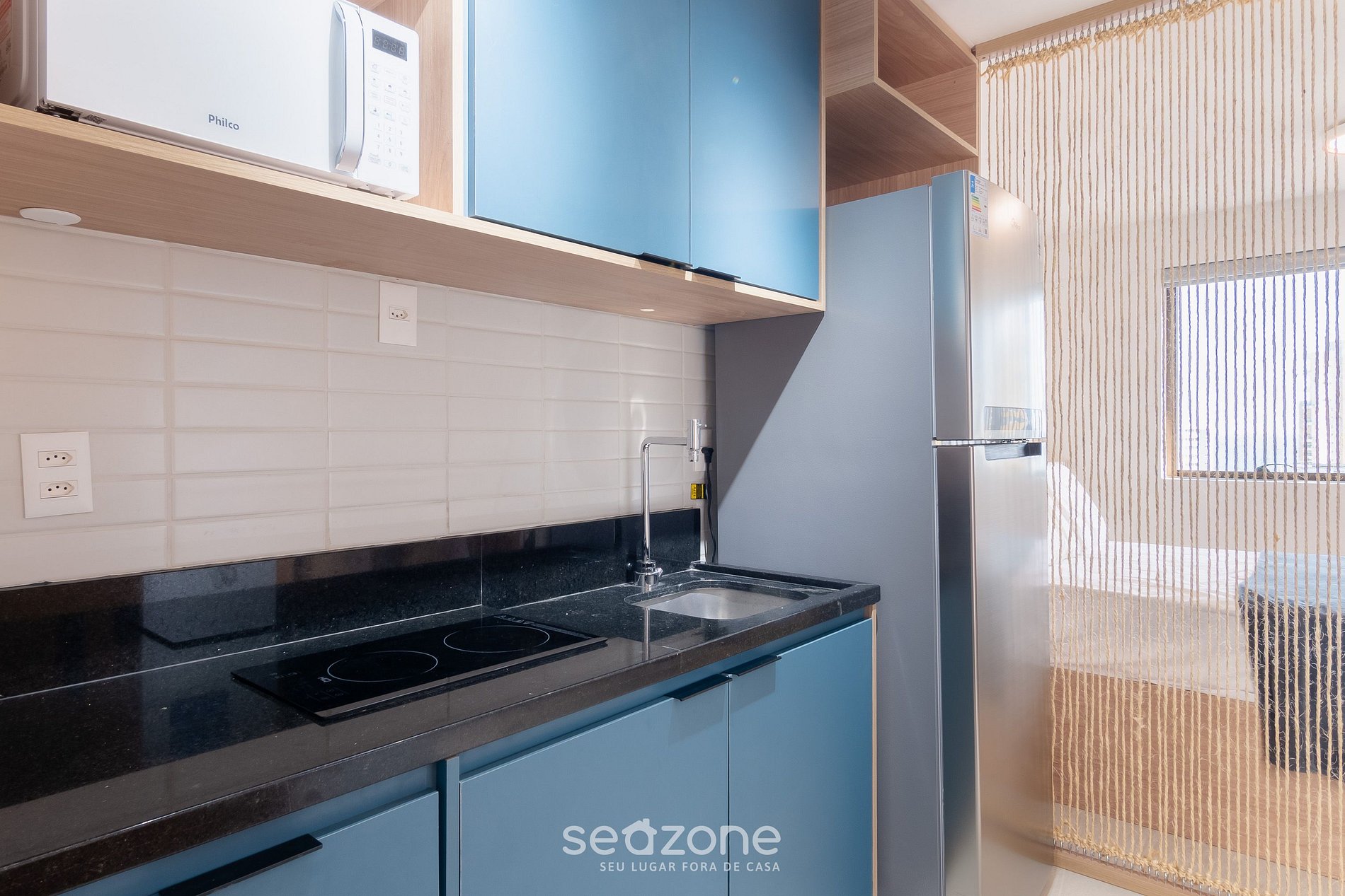 - Cozinha completa com geladeira, fogão cooktop por indução, microondas, liquidificador, taças de vinho, panelas, louças e utensílios;