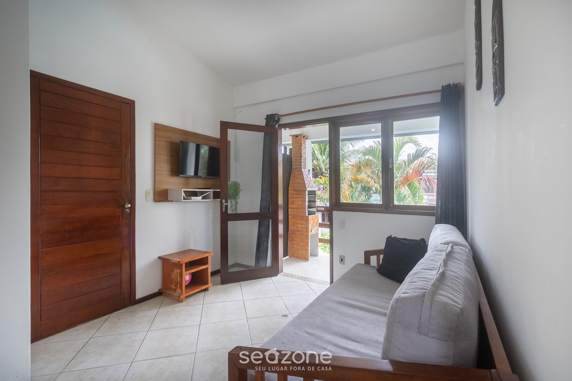 - Sala com com sofá, Smart TV e ventilador de teto;