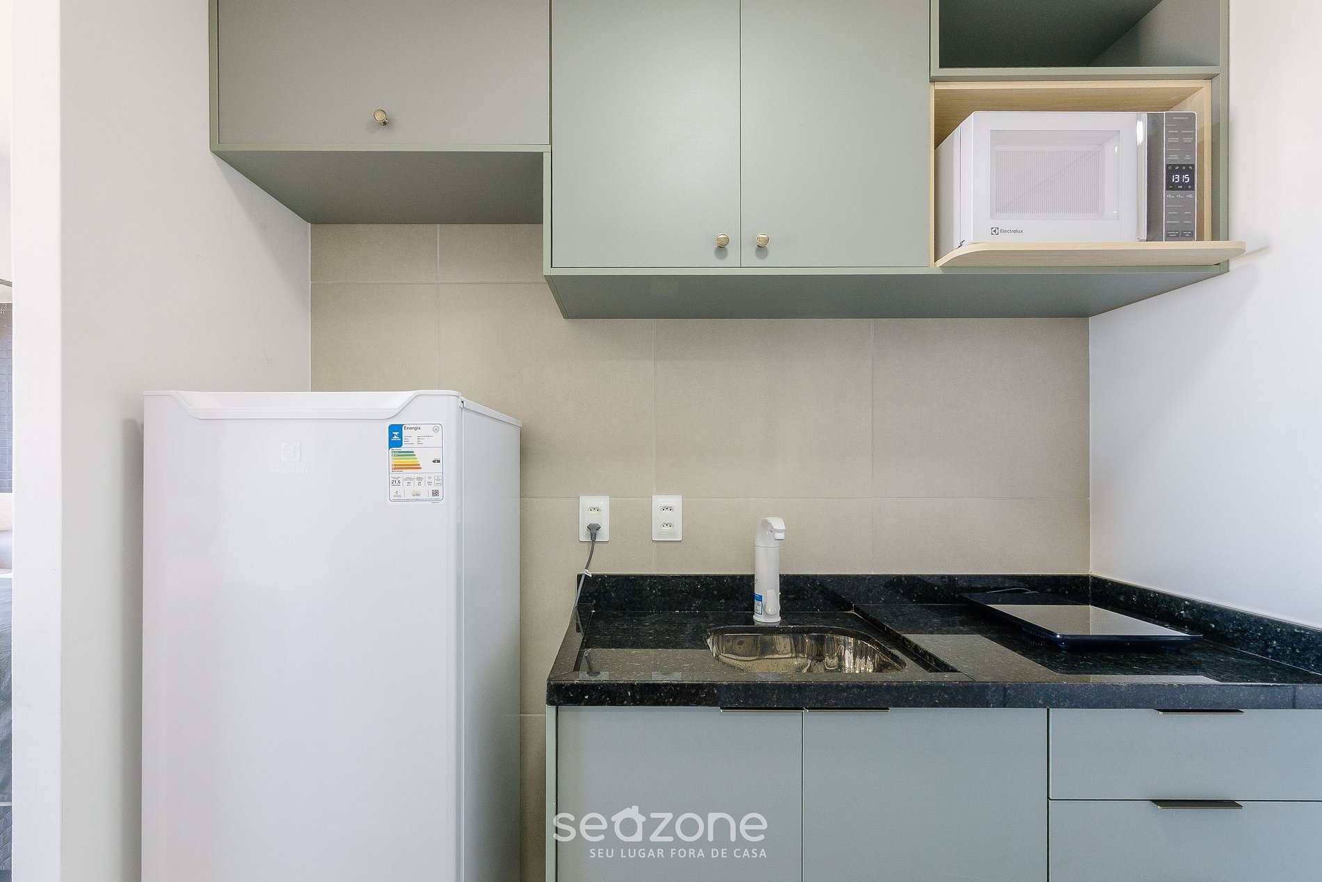 - Cozinha completa com geladeira, fogão cooktop por indução, micro-ondas, sanduicheira, Kit café (suporte para filtro, garrafa térmica), liquidificador, taças de vinho, panelas, louças e utensílios;
