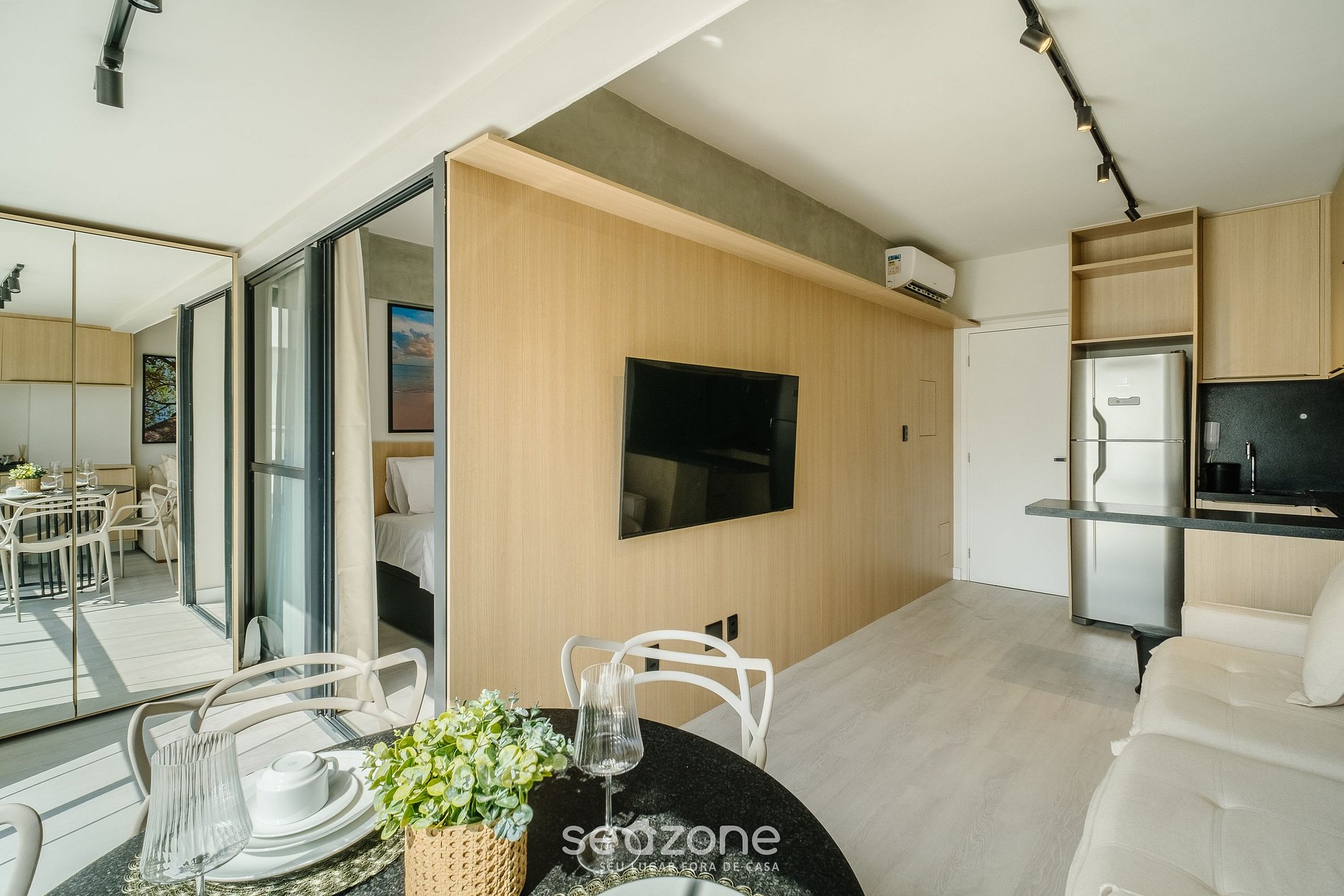 Com 1 quarto com cama queen, sala climatizada com smart TV, cozinha equipada e vista para a cidade. O prédio oferece rooftop com piscina, coworking e academia. A poucos metros da Praia da Barra e próximo ao Farol, mercados, cafés e ótimos restaurantes.