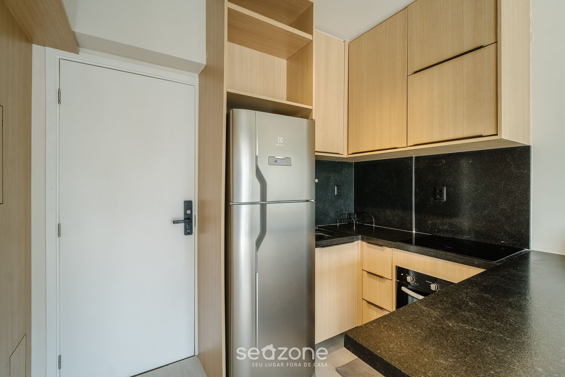 - Cozinha completa com geladeira, fogão cooktop por indução, micro-ondas, sanduicheira, cafeteira elétrica, liquidificador, taças de vinho, panelas, louças e utensílios.
