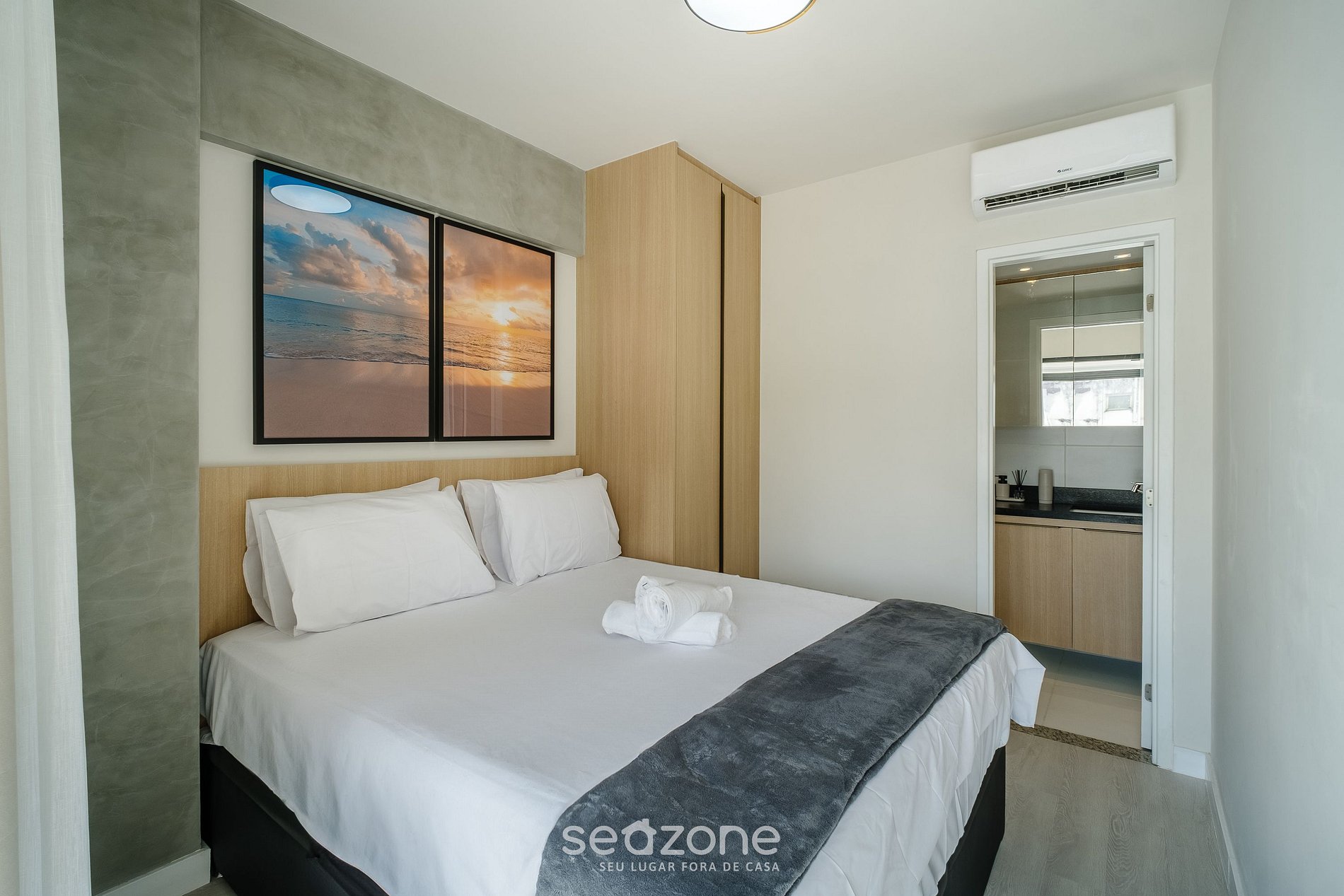 Com 1 quarto com cama queen, sala climatizada com smart TV, cozinha equipada e vista para a cidade. O prédio oferece rooftop com piscina, coworking e academia. A poucos metros da Praia da Barra e próximo ao Farol, mercados, cafés e ótimos restaurantes.