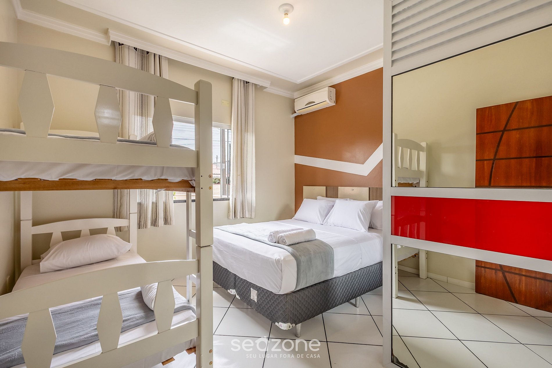- 1 Quarto com cama queen, beliche para 2 pessoas, armário e ar-condicionado;