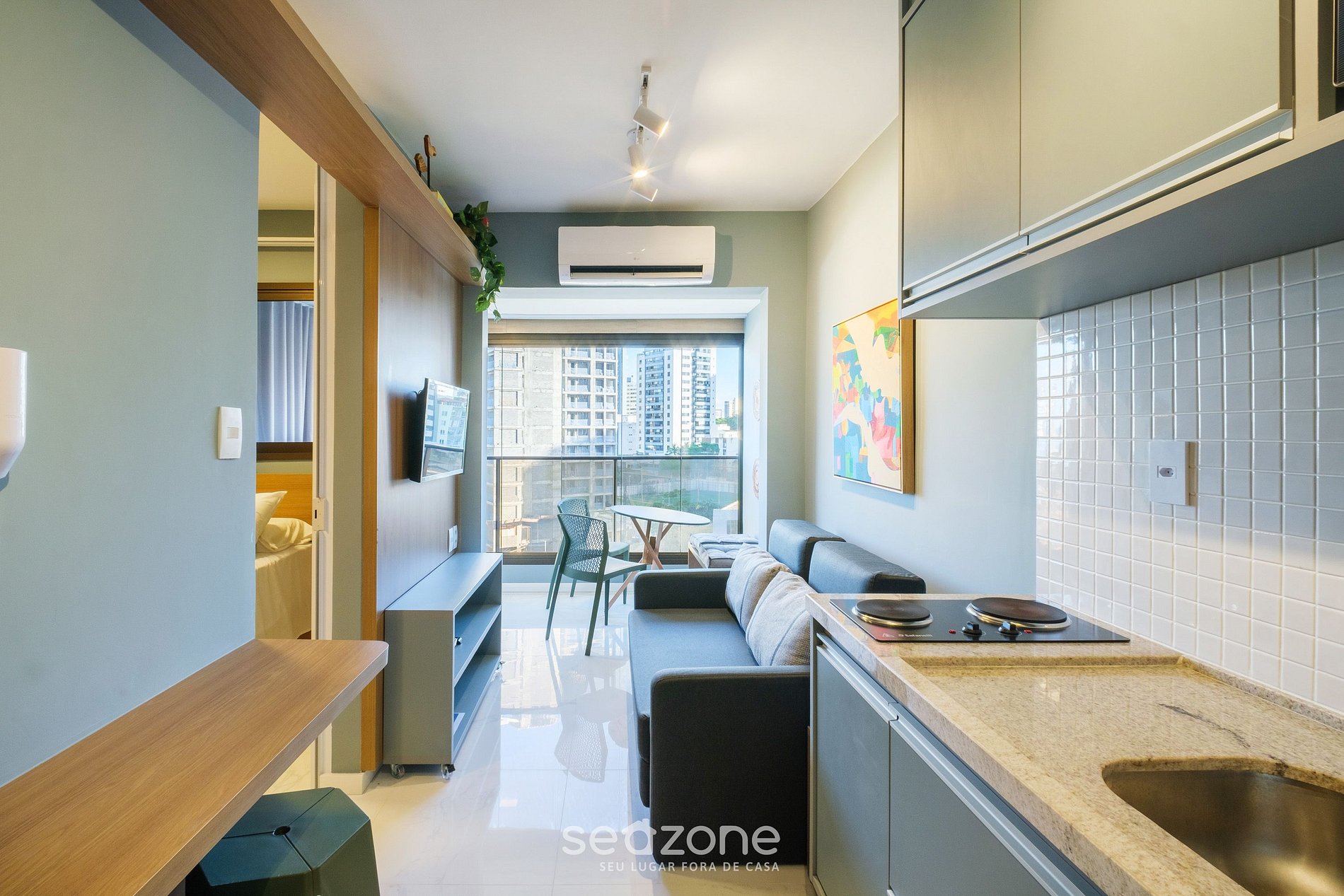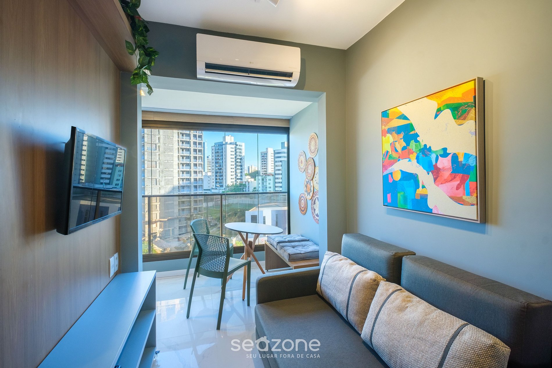 - Sala de estar com sofá-cama de casal, Smart Tv e ar-condicionado;