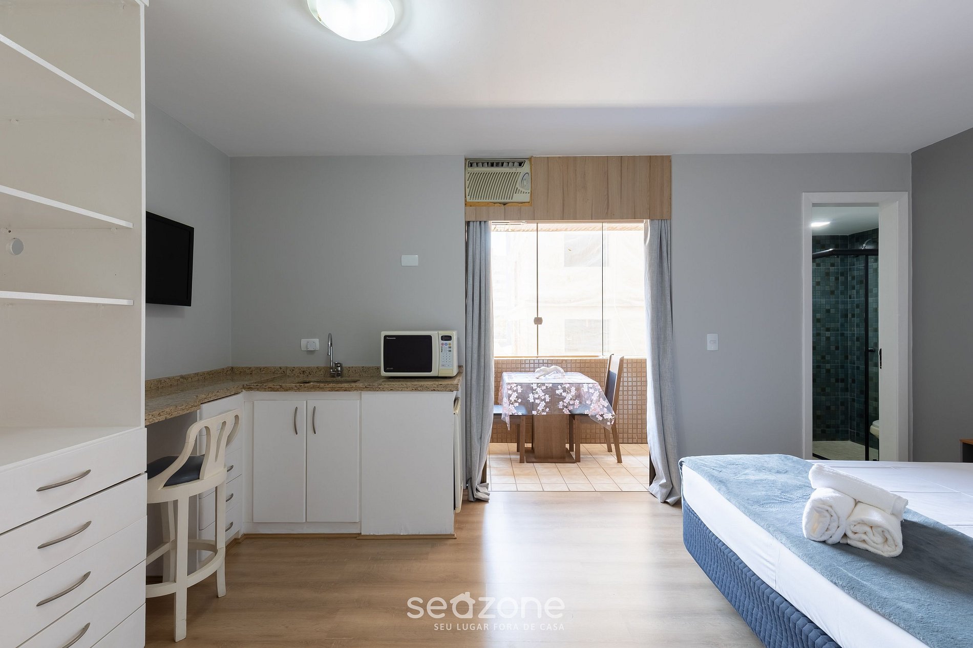 - Cozinha compacta com frigobar, micro-ondas, sanduicheira, Kit café (suporte para filtro, garrafa térmica), chaleira elétrica, taças de vinho, louças e utensílios;