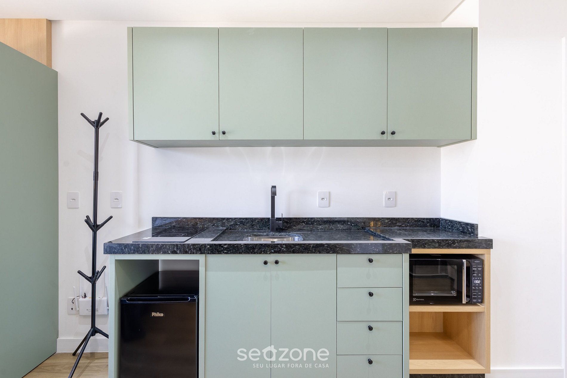 - Cozinha completa com frigobar, fogão cooktop (indução), micro-ondas, sanduicheira, cafeteira elétrica, chaleira elétrica, liquidificador, panelas, louças e utensílios;